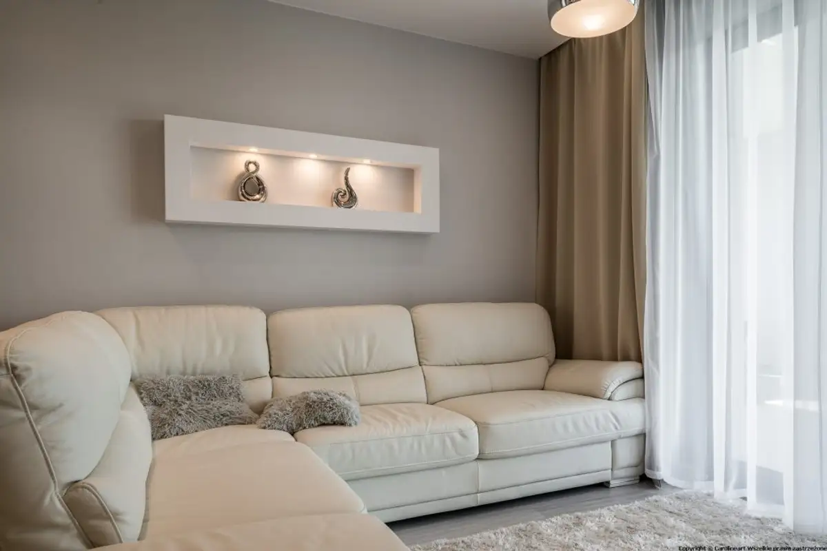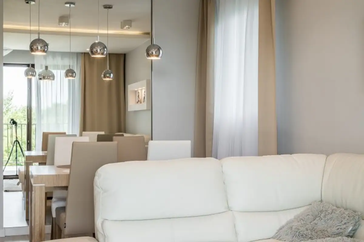 The dining area is reduced in size because the living room also provides a wooden table around which four leather-upholstered chairs are placed. Maintaining their design, the extendable corner sofa, made of white leather, harmonizes with the rest of the textile accessories.
