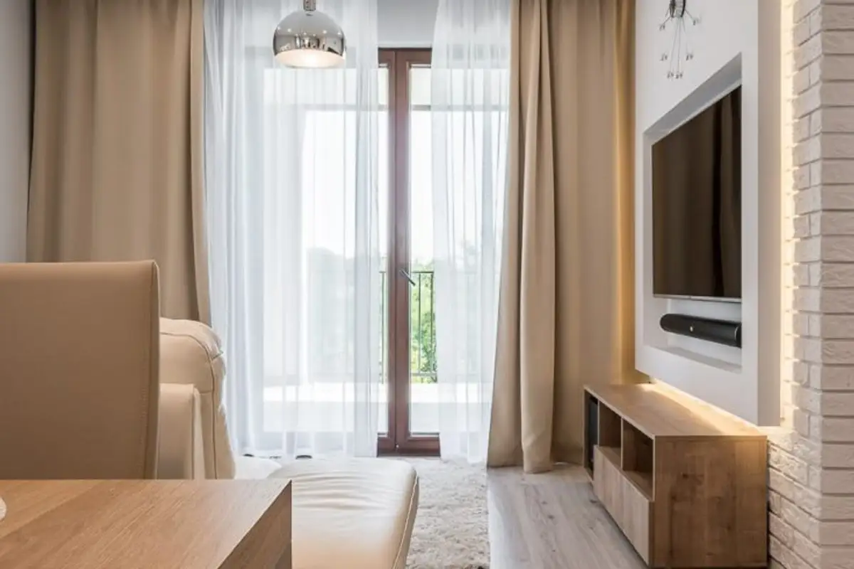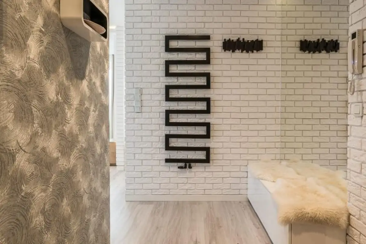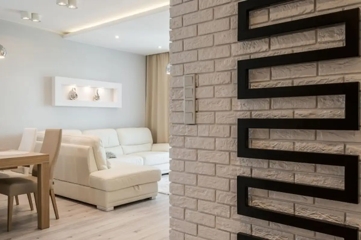 Its structure is divided into two rooms: living room and kitchen, discreetly separated by a small brick-like wall. This type of partition wall represents the optimal solution to show the specific roles of each zone while maintaining cohesion between them through the maintenance of a large, open space.