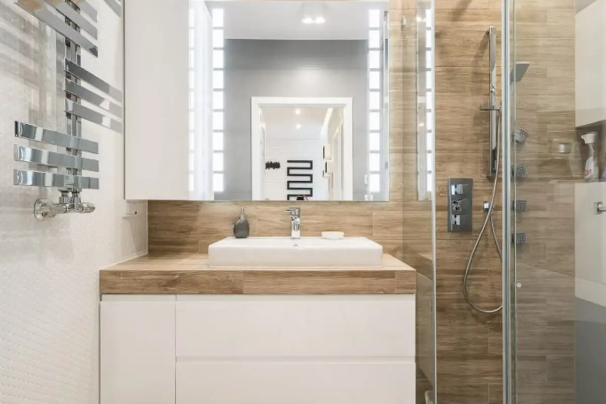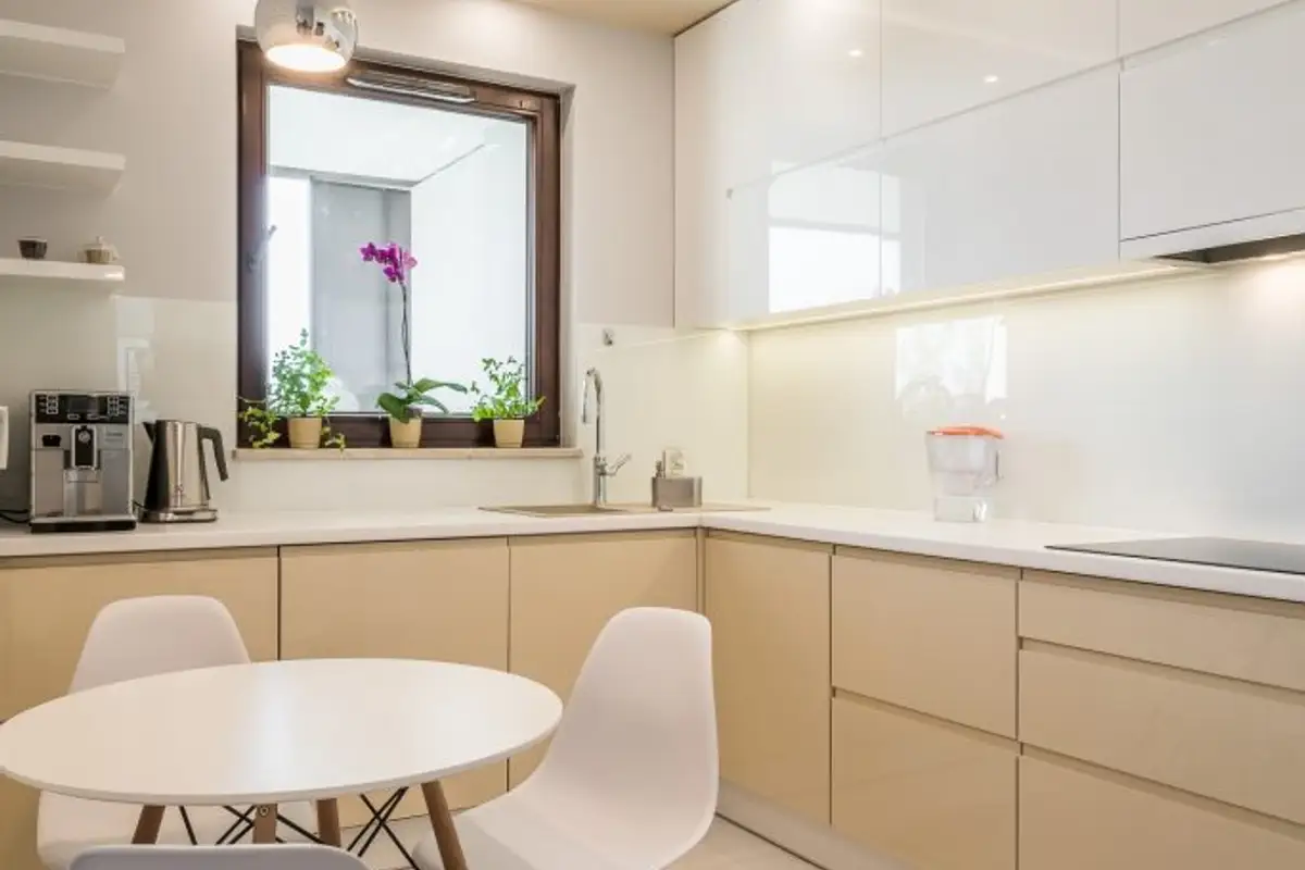 From a chromatic point of view, pastels represented by beige, nude and natural wood are complemented by silver accents of luxurious accessories. The kitchen furniture is minimalist and functional, the simplicity of the glossy wood emphasizing the elegance of the entire arrangement.