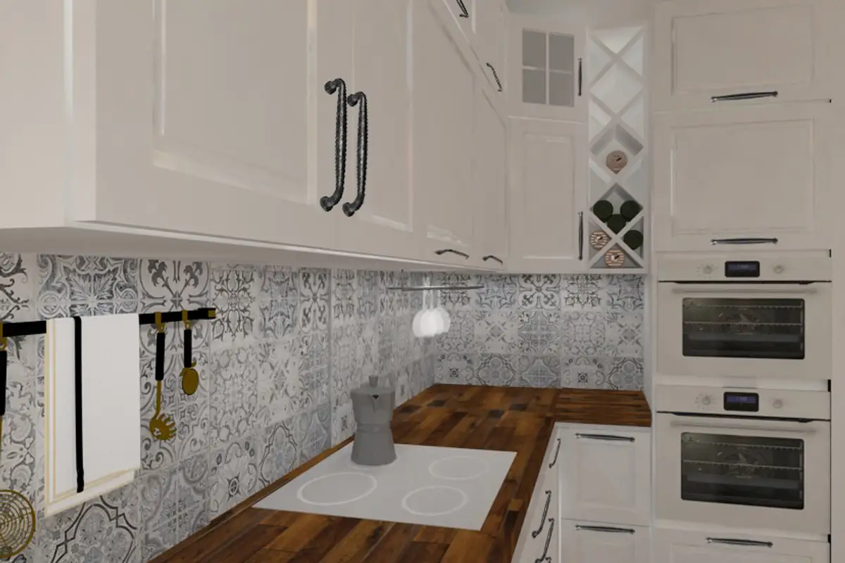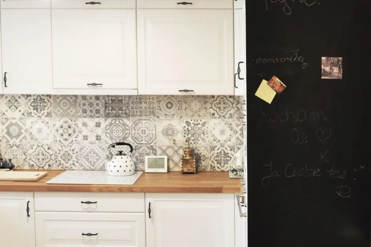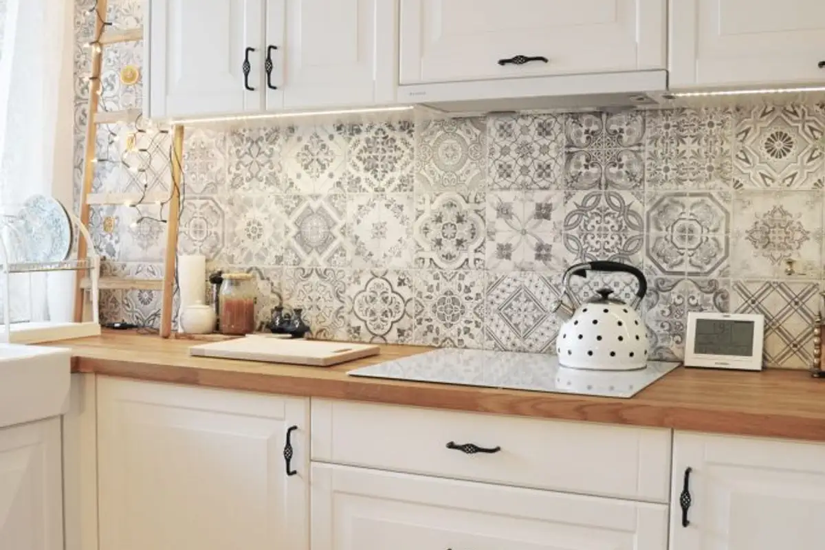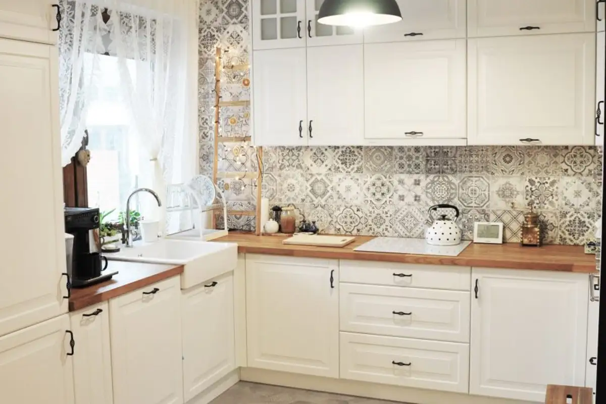The Scandinavian and rustic styles can be harmoniously combined, as we can see in this case where we are talking about a small kitchen. White is the main chromatic element, and compositionally, natural wood and vintage-patterned tiles stand out.