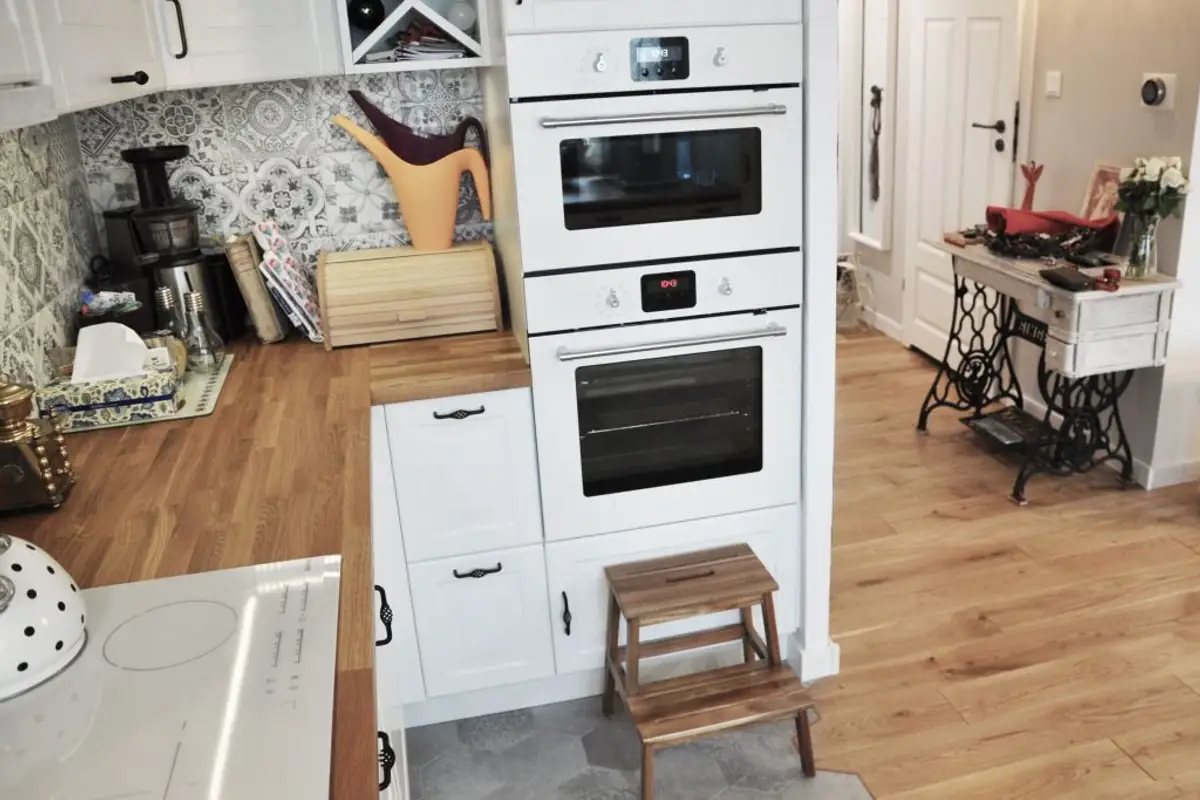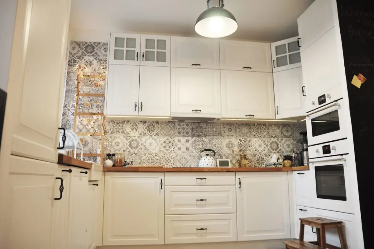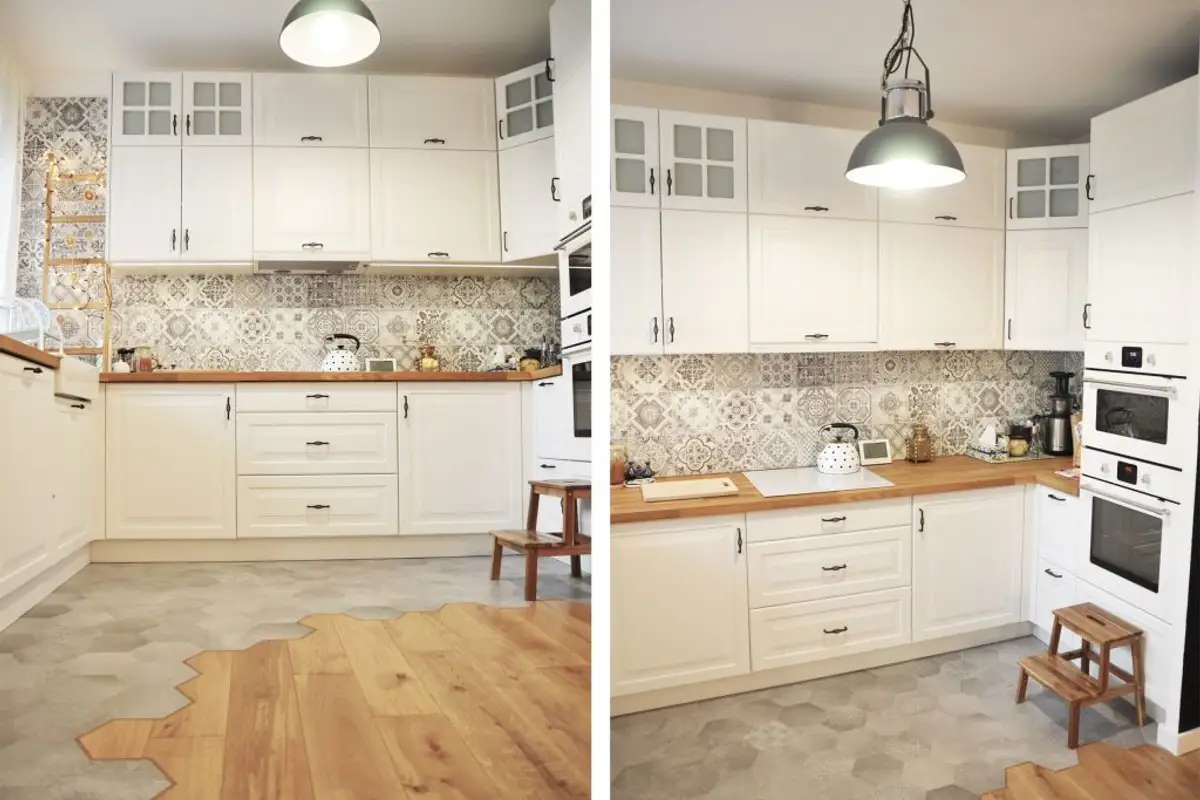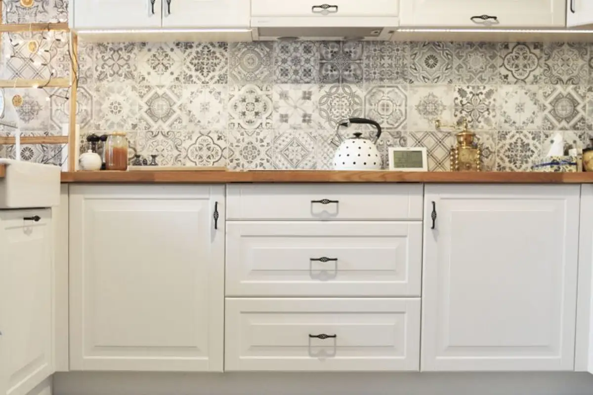 The Scandinavian and rustic styles can be harmoniously combined, as we can see in this case where we are talking about a small kitchen. White is the main chromatic element, and compositionally, natural wood and vintage-patterned tiles stand out.
