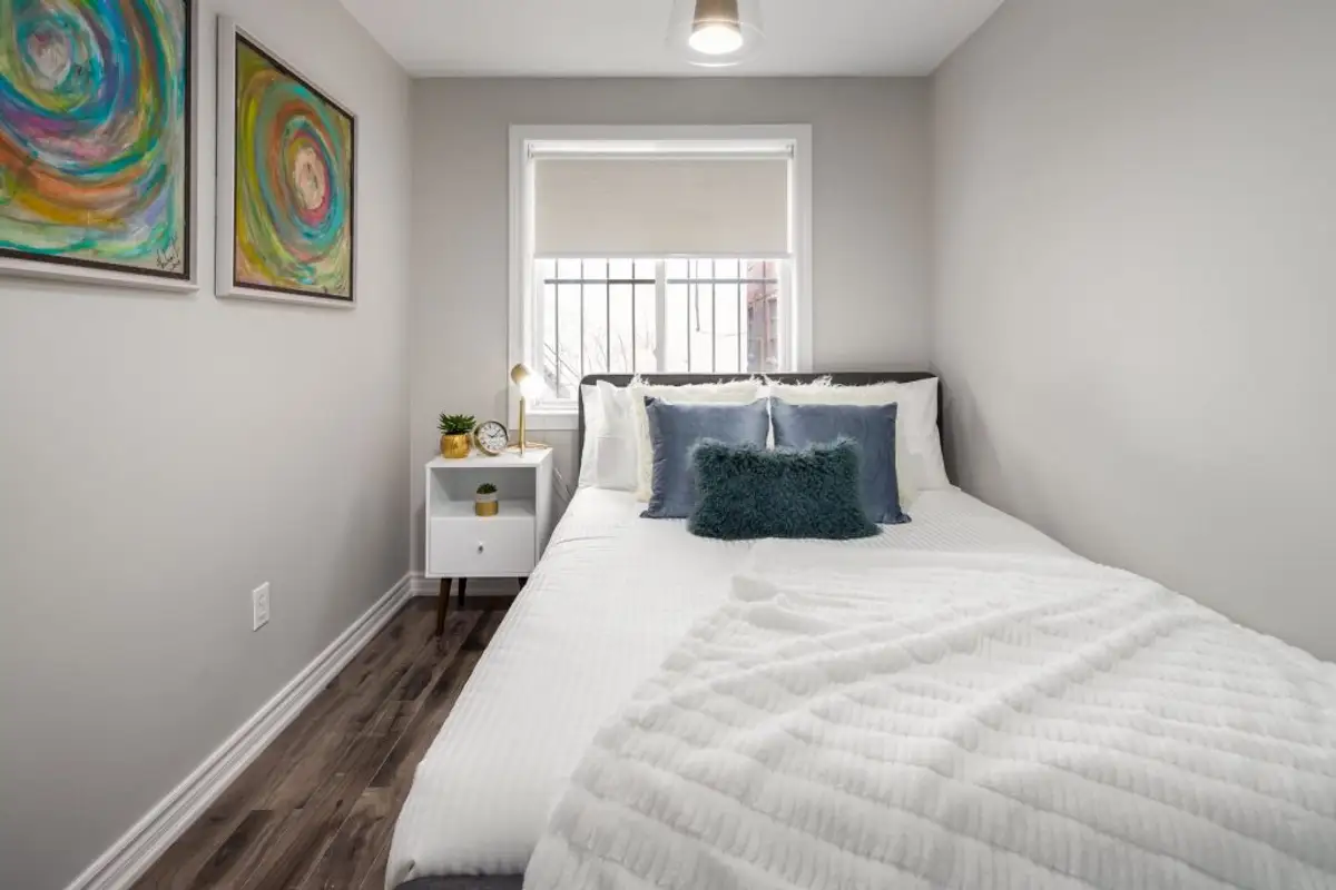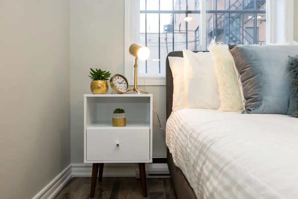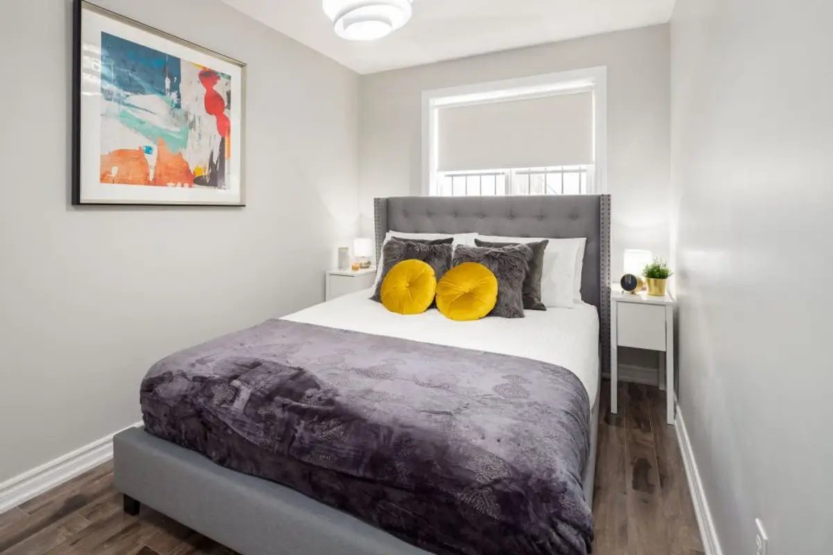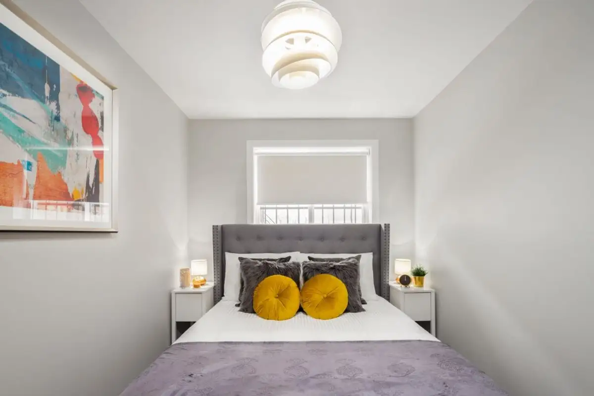In the case of the bedrooms, since we are talking about a limited area, the furniture consists of double beds accompanied on the sides by narrow nightstands. As for the visual transformation, shades of gray, gold metallic details, and bright colors such as yellow and orange are used.