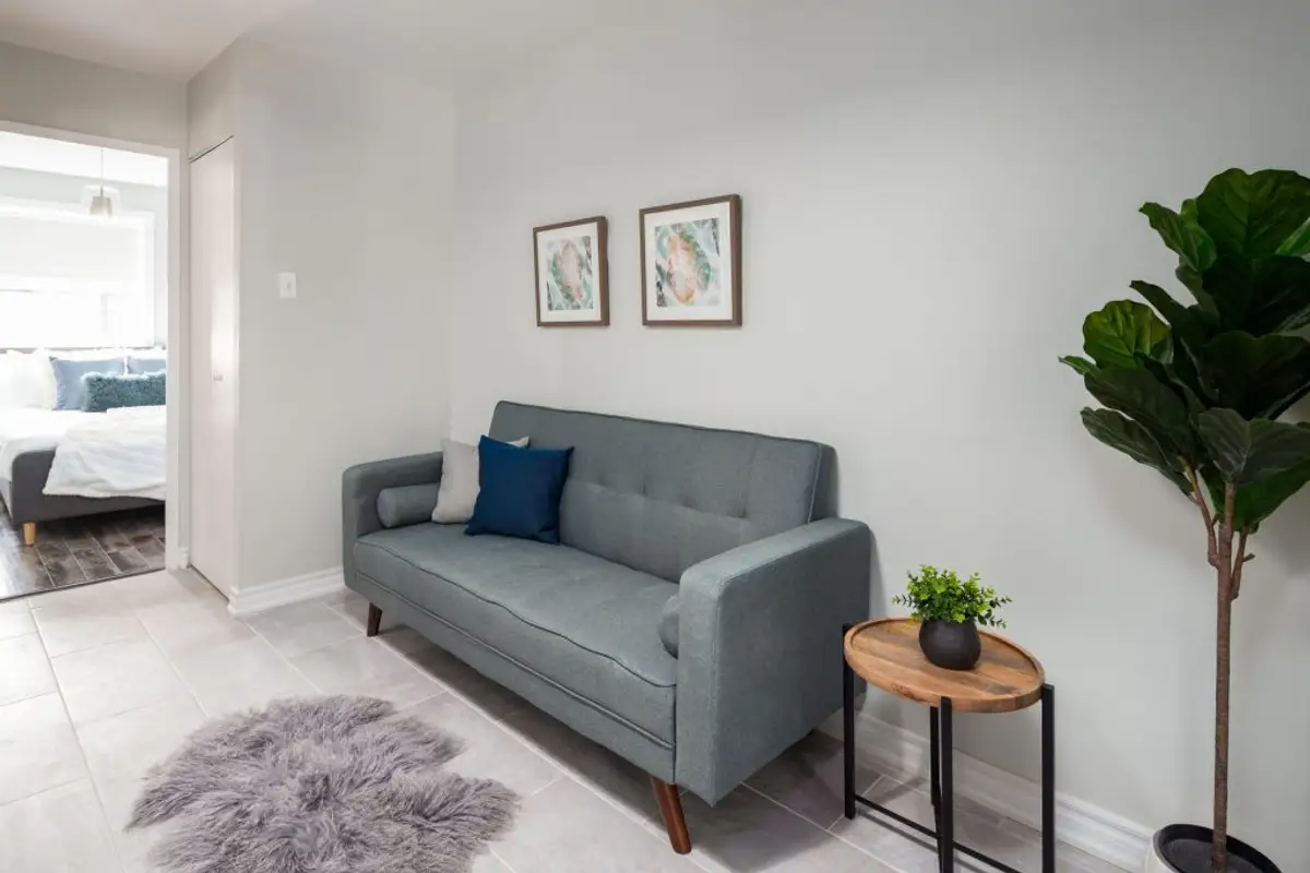The transition to the other rooms is made through a hallway designed as a relaxation space. This is exploited by placing a comfortable sofa, a wooden table, abstract paintings and decorative plants, resulting in a room with a Scandinavian look and an extremely practical and useful role.