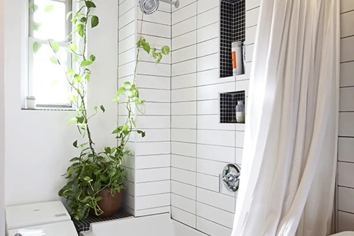 We like the idea of introducing a niche in the wall for storing various bathroom products, of course, also black with white grout. A novelty element, which is actually a trend we have encountered in other designs, is the presence of plants in the bathroom (read more about this topic here: trends in interior design with plants for the bathroom).