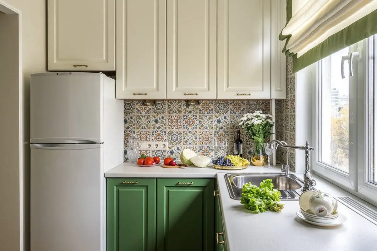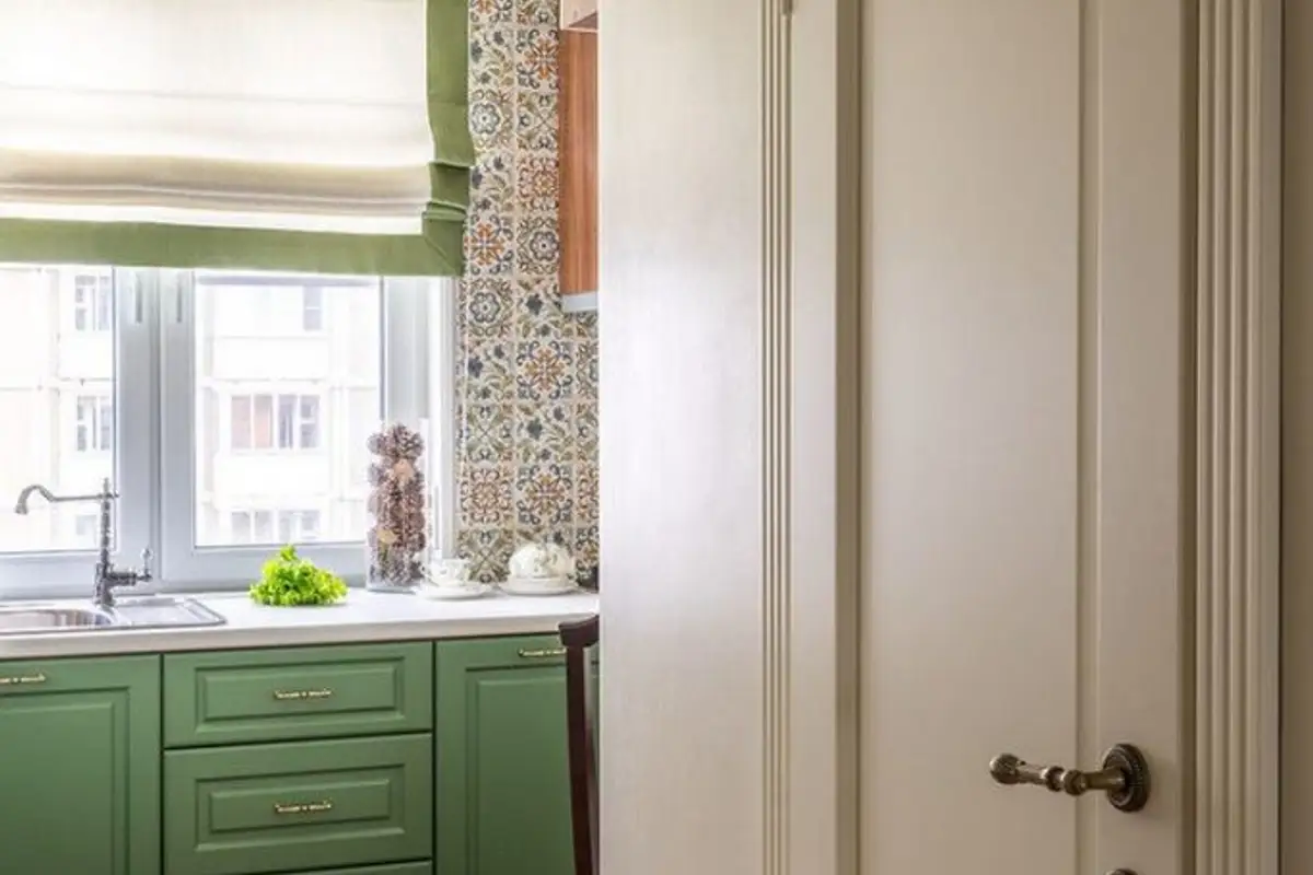 The main furniture units have green fronts with milled doors, while the upper ones are in a pleasant cream shade to keep the layout as bright and airy as possible. To prevent green from being an isolated hue, the chromatic motif was also taken up at the level of the Roman-style drapery that beautifully dresses the window.