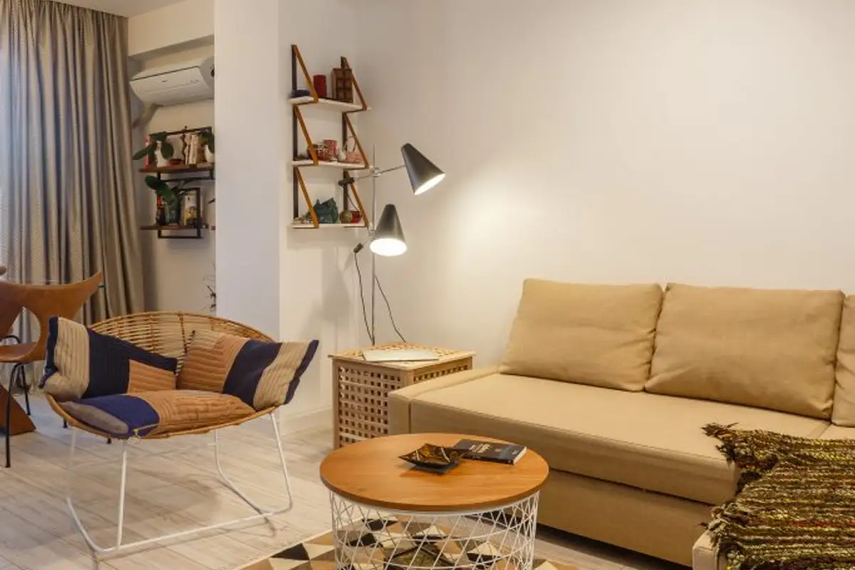 Although natural light has access in a significant amount, artificial lighting components are positioned to ensure correct and practical illumination at the same time, as does the floor lamp near the sofa.