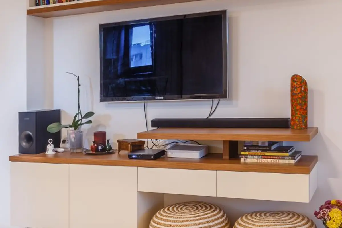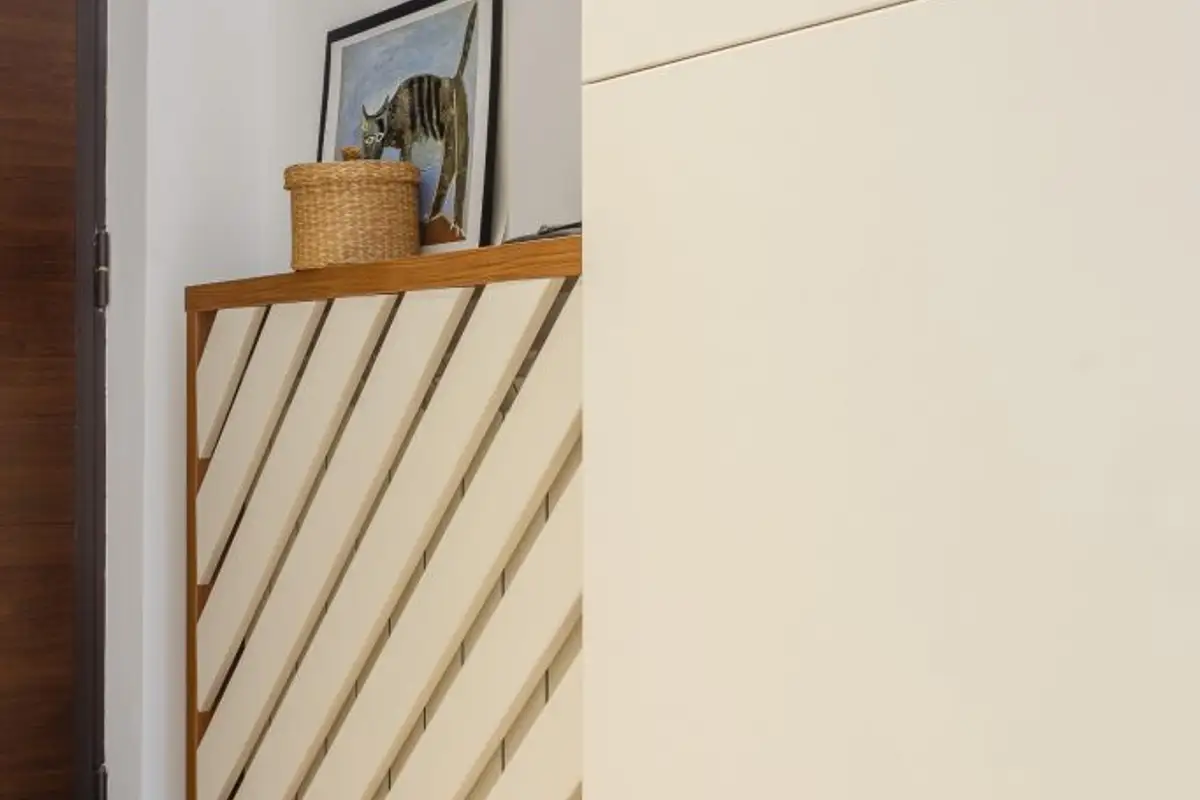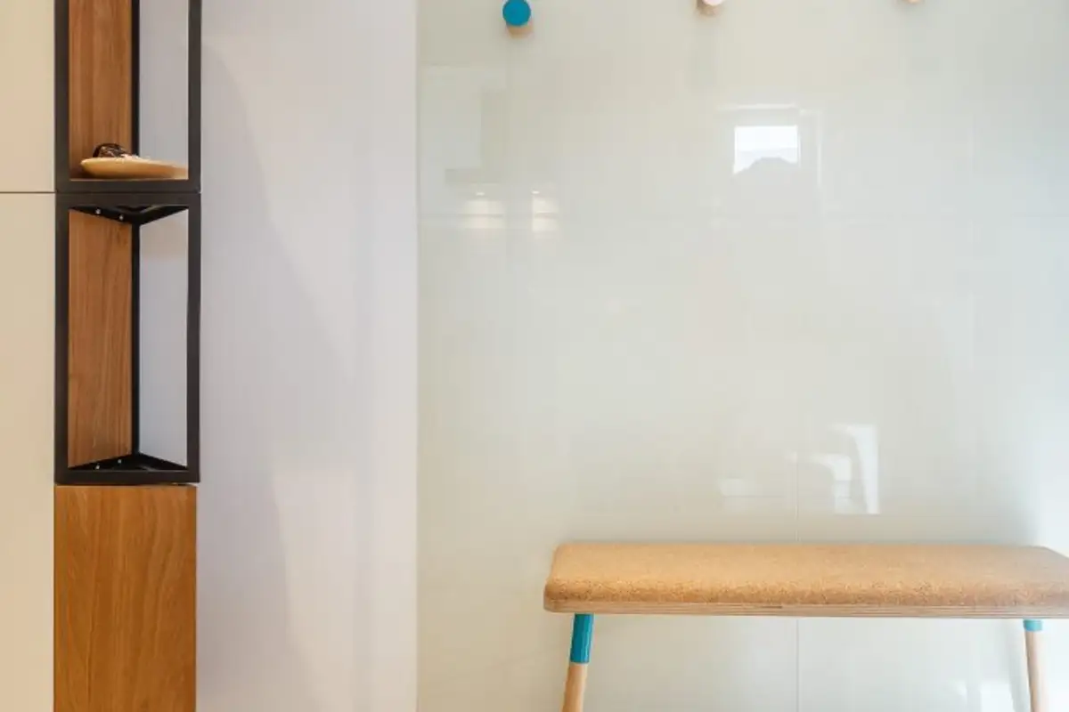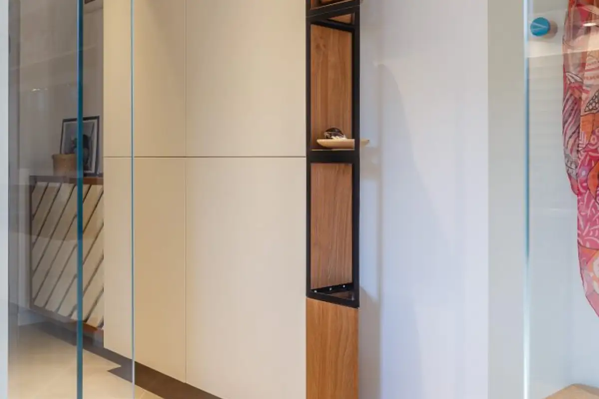 The relaxation area is extremely bright, and the use of beige, white, and natural wood in elm and walnut tones brings warmth and naturalness. To create a sense of floating harmony among all elements, the furniture pieces are suspended on the wall, as can be seen in the case of the bookcase or shoe cabinet.