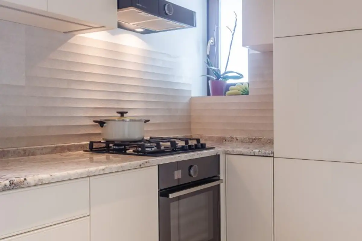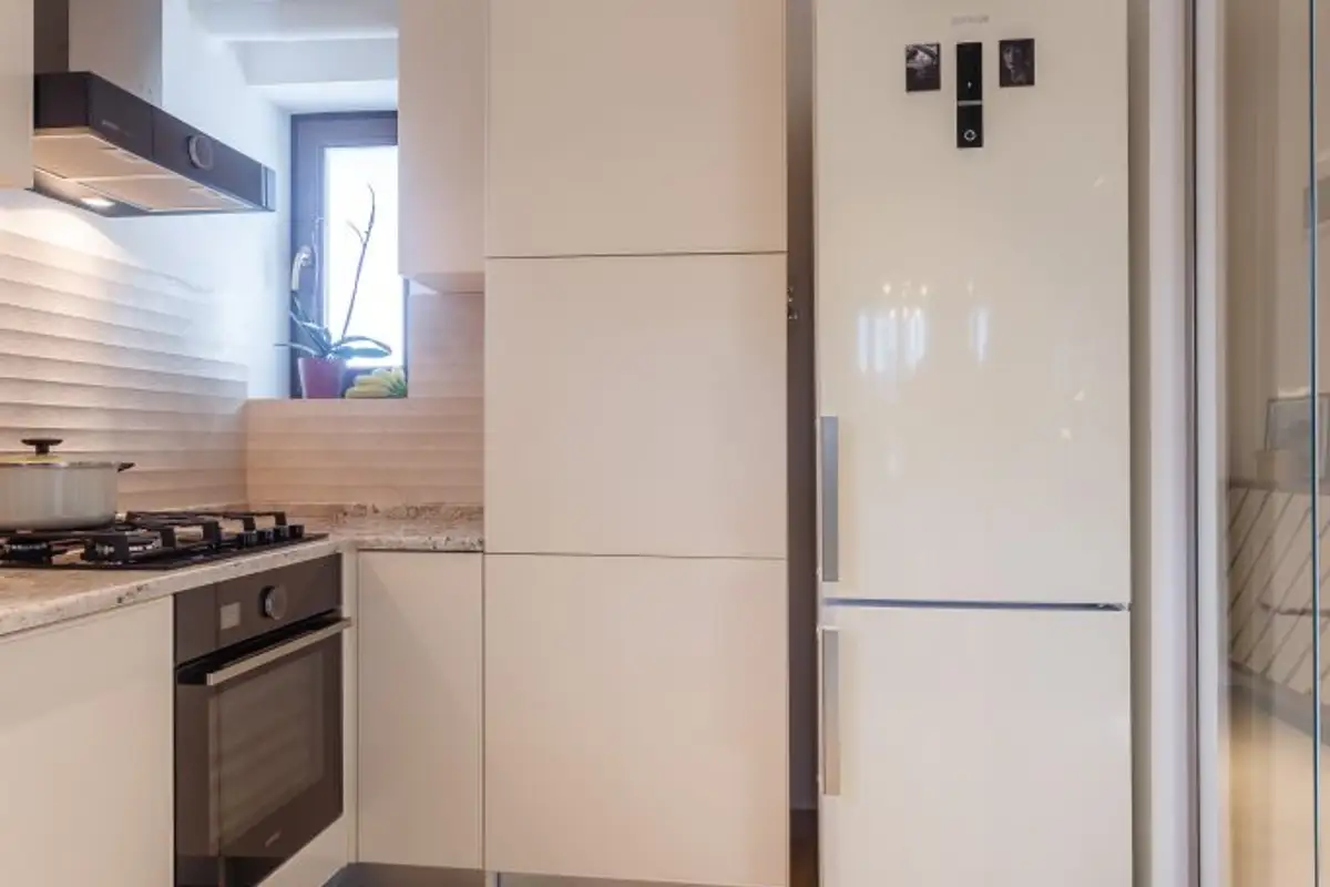 The furniture is minimalist, compact, in shades of glossy white, and together with the bar table and chairs with a modern design, places the kitchen in a contemporary time frame.