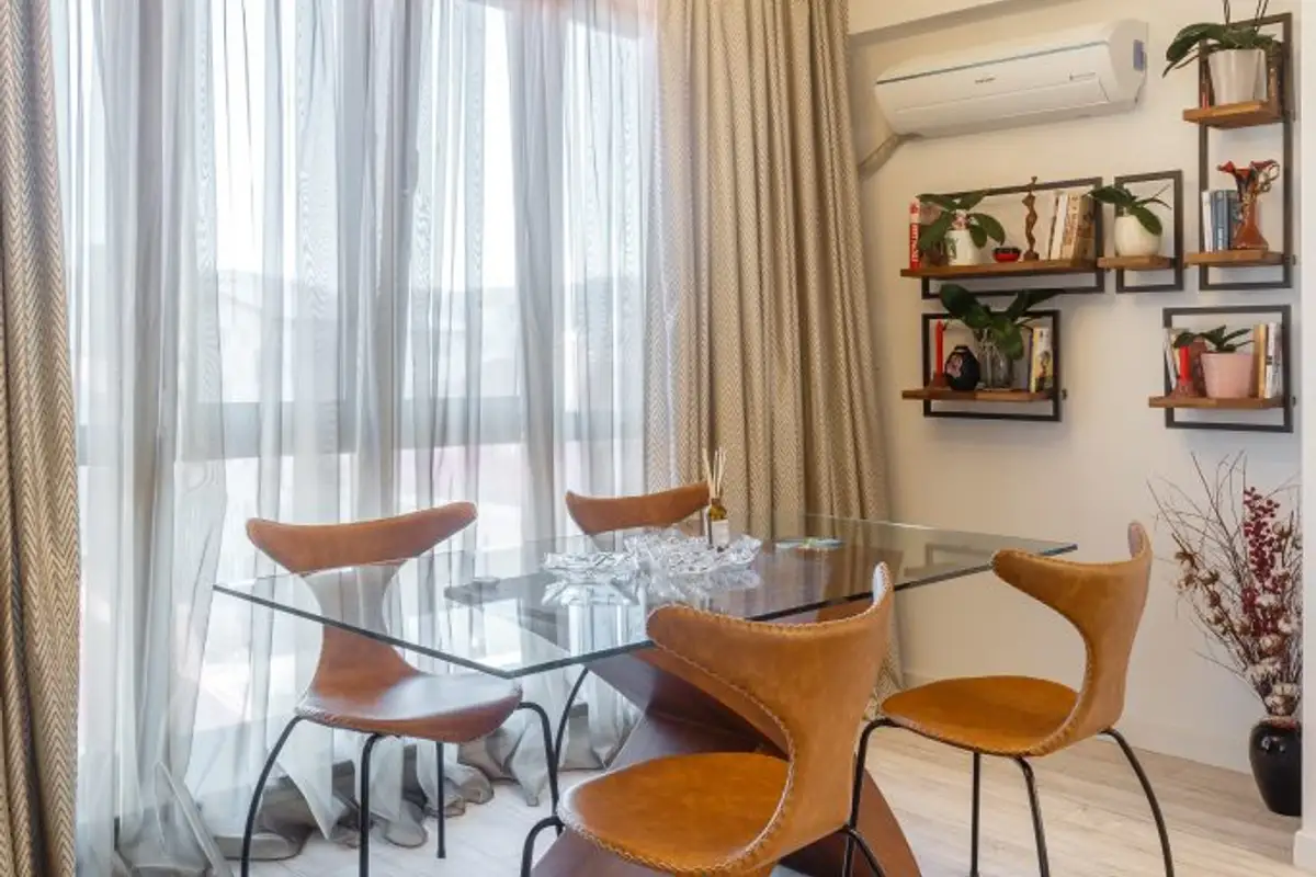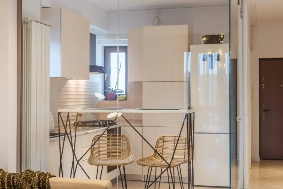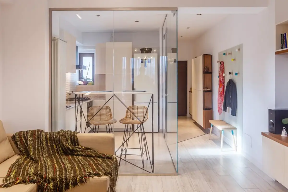 The delineation of the roles of the two rooms is done in a non-conformist way. The food preparation and serving area finds its unity and uniqueness to the same extent, separating itself with the help of glass: a modern option to maintain the connection between the two rooms while also providing acoustic and olfactory insulation.