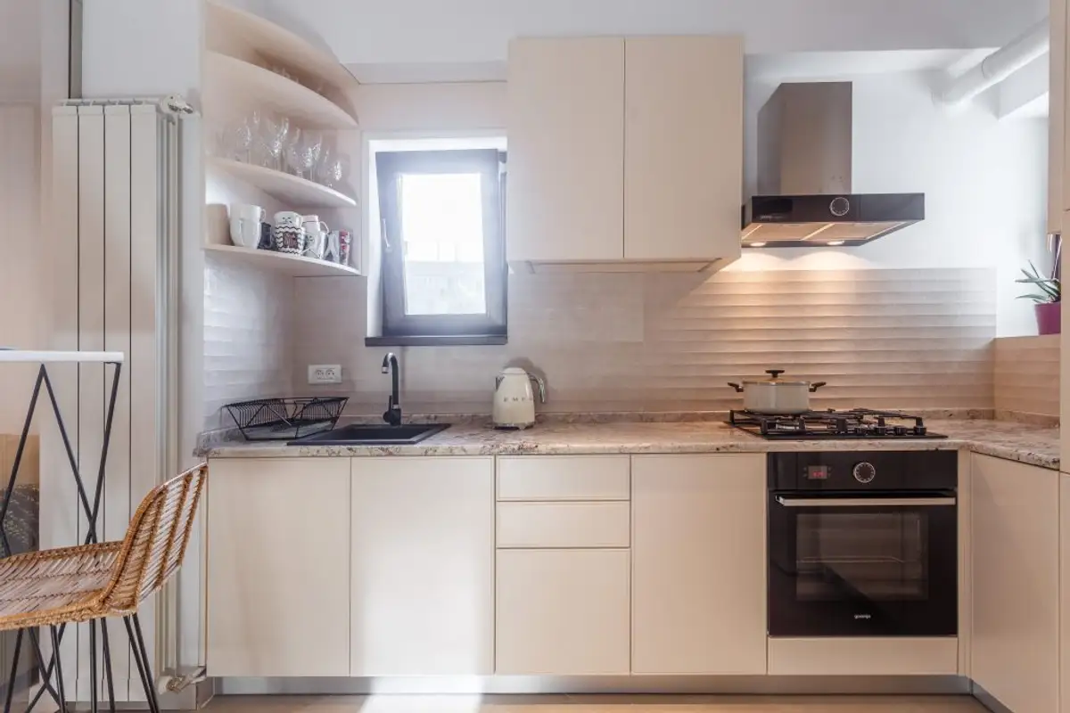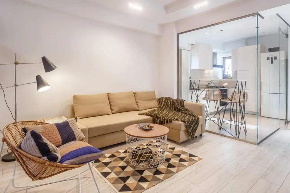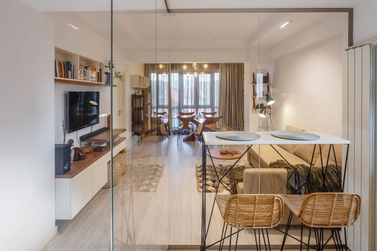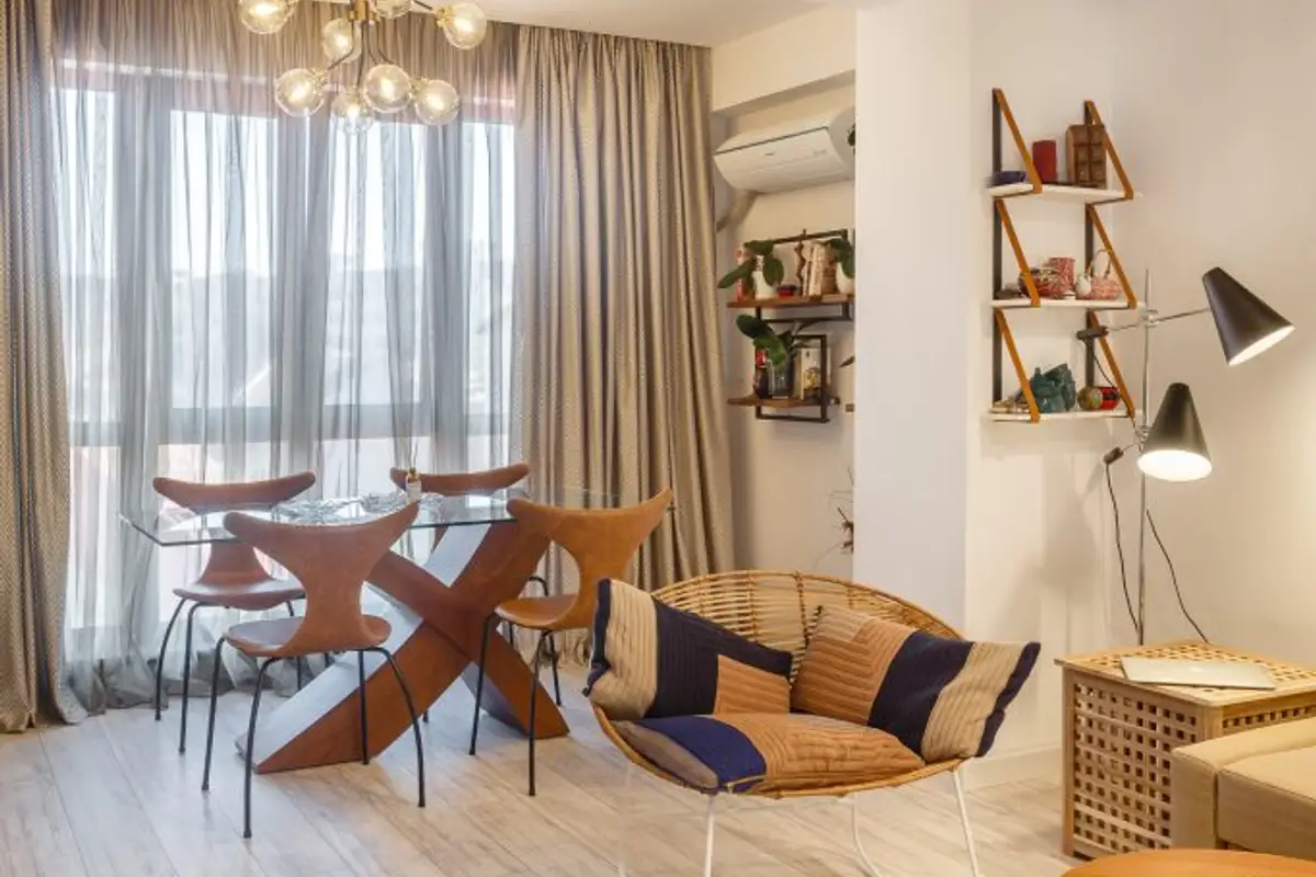 The delineation of the roles of the two rooms is done in a non-conformist way. The food preparation and serving area finds its unity and uniqueness to the same extent, separating itself with the help of glass: a modern option to maintain the connection between the two rooms while also providing acoustic and olfactory insulation.