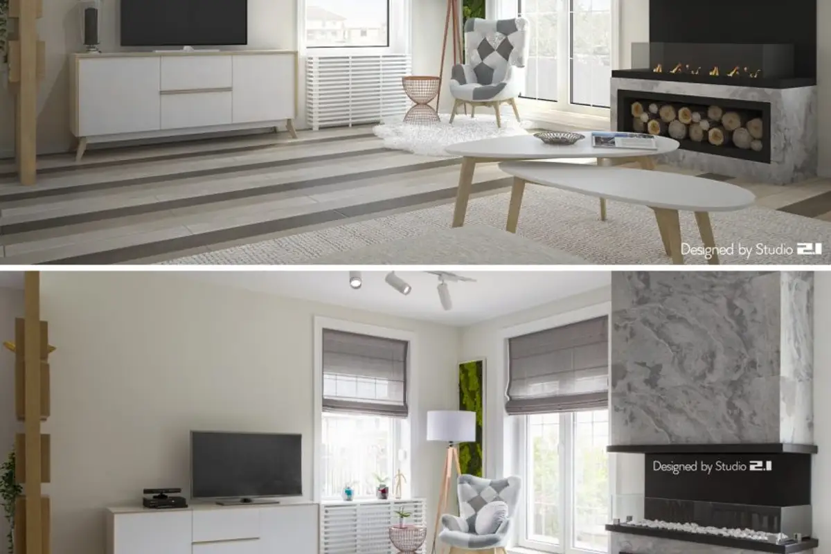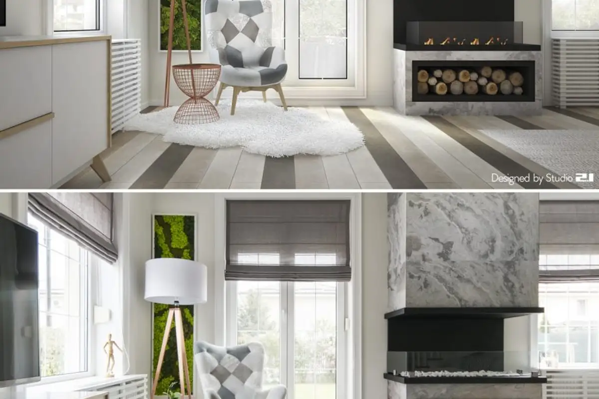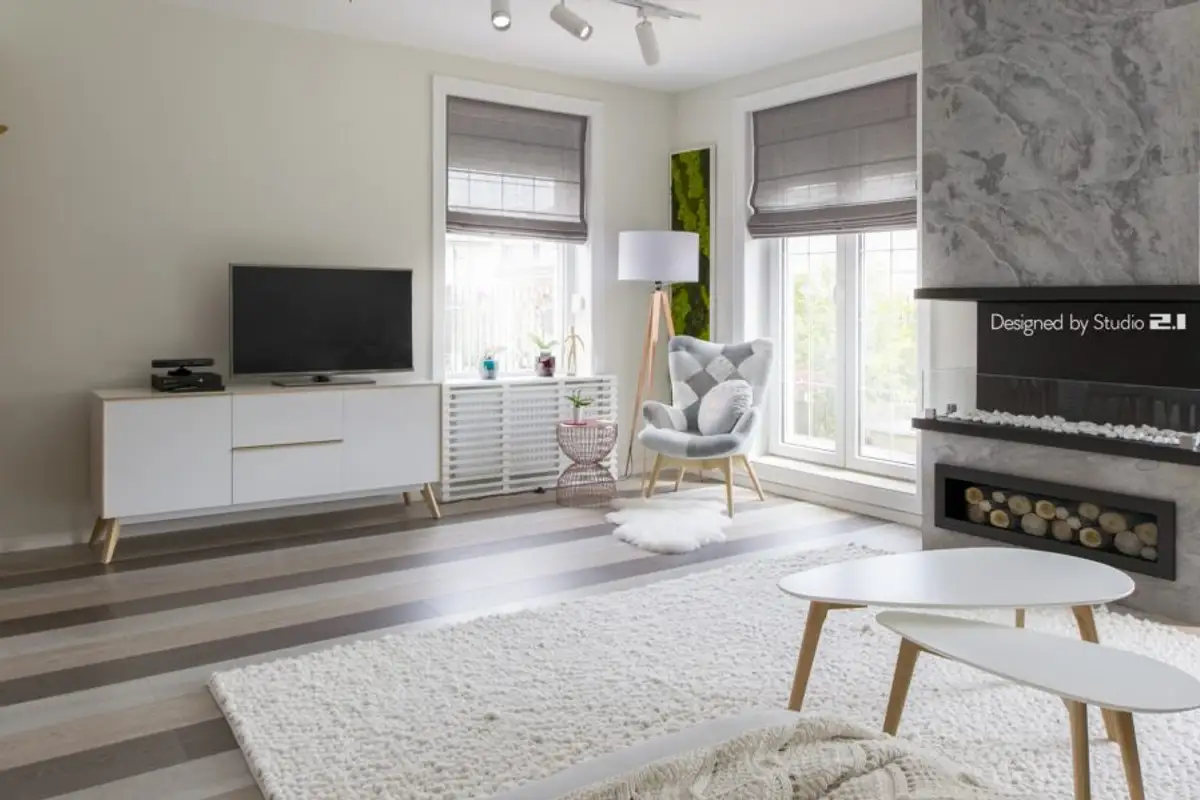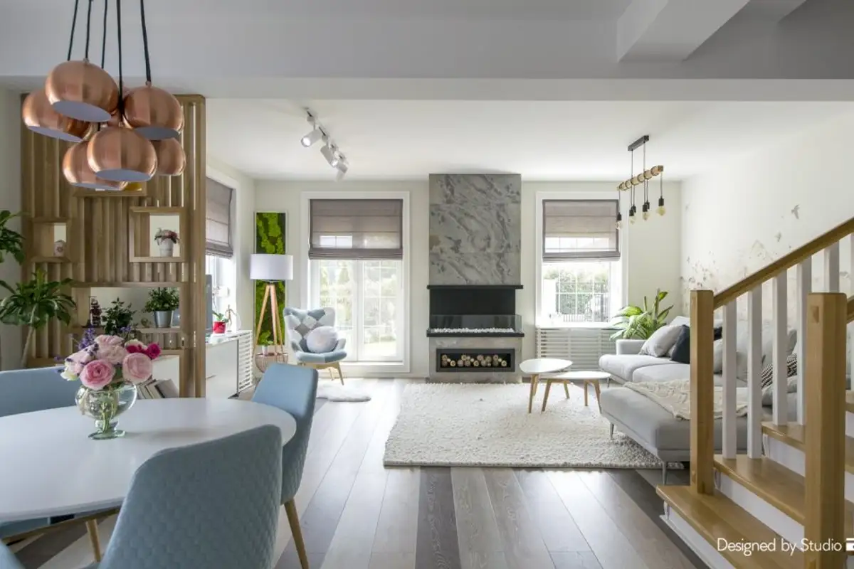 Functionally, several different zones were designed, visually delimited by decorative elements, such as the wooden wainscoting that separates the dining area from the living room. The main piece is the fireplace around which all the other details of the living room gravitate, such as the conversation area or the reading space created near the window.