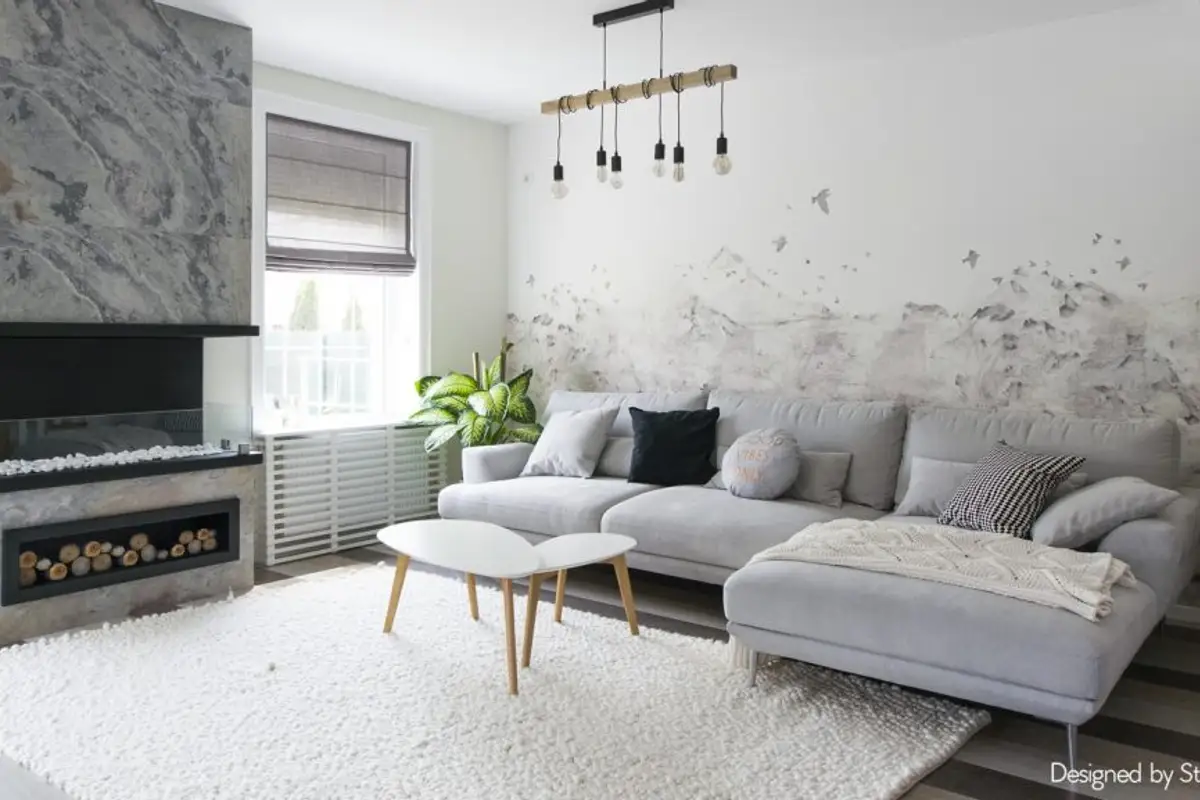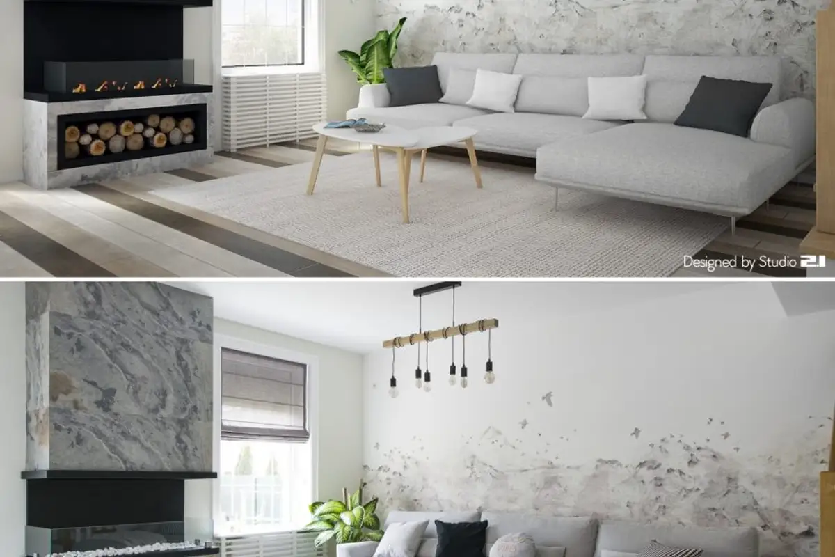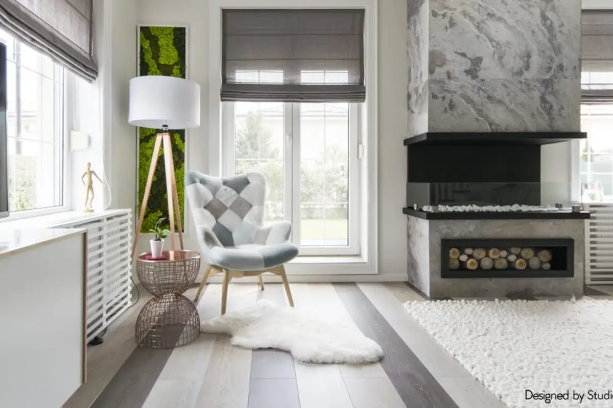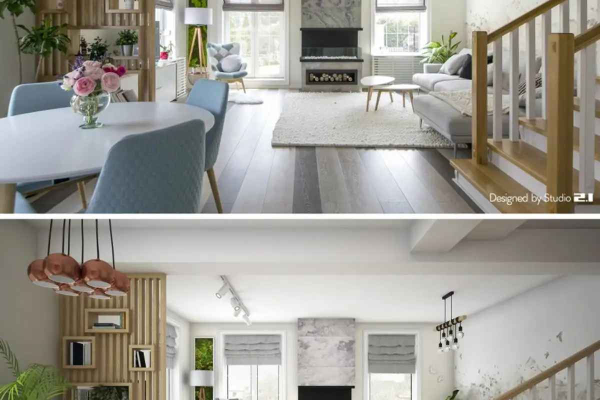 Functionally, several different zones were designed, visually delimited by decorative elements, such as the wooden wainscoting that separates the dining area from the living room. The main piece is the fireplace around which all the other details of the living room gravitate, such as the conversation area or the reading space created near the window.