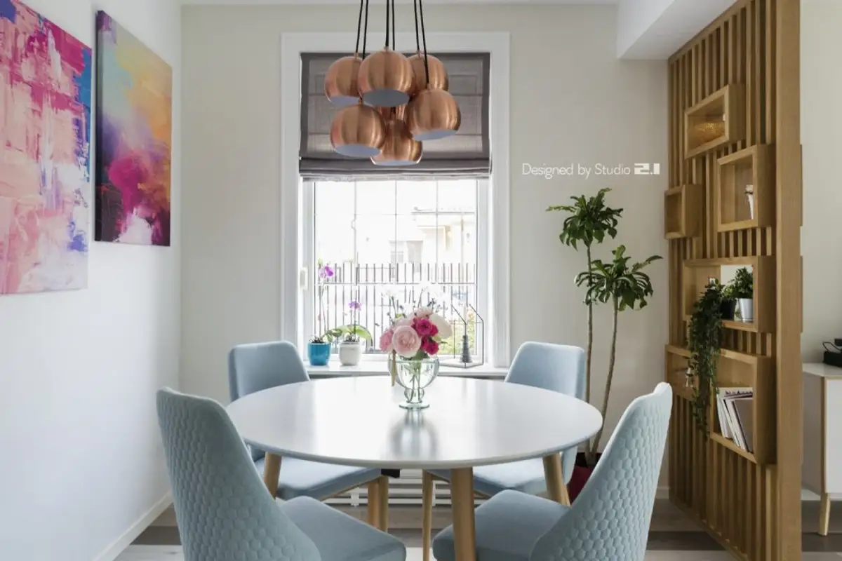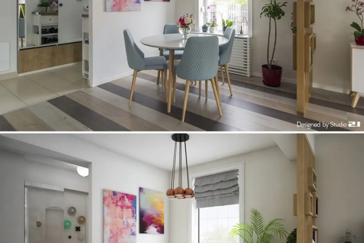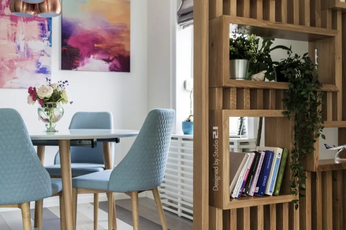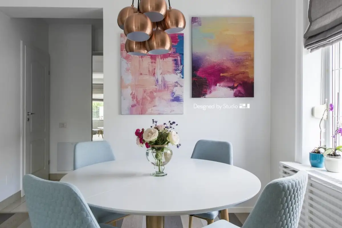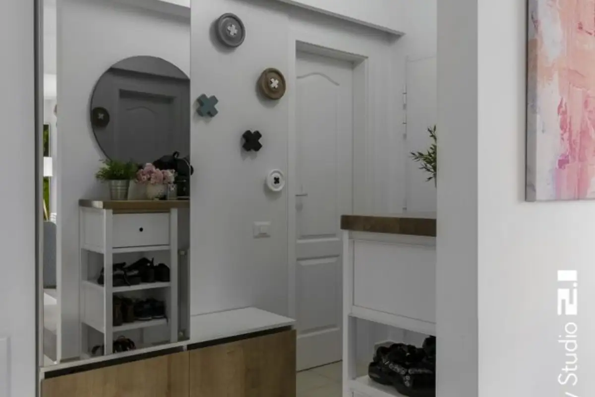 In the reduced-size hallway, a functional arrangement was desired, with the necessary storage (see wardrobe and shoe cabinet). The coat rack area, with different hangers, gives the space a more playful note, while the balloon-shaped chandelier completes the cheerful spirit meant to cheer you up every time you return home.