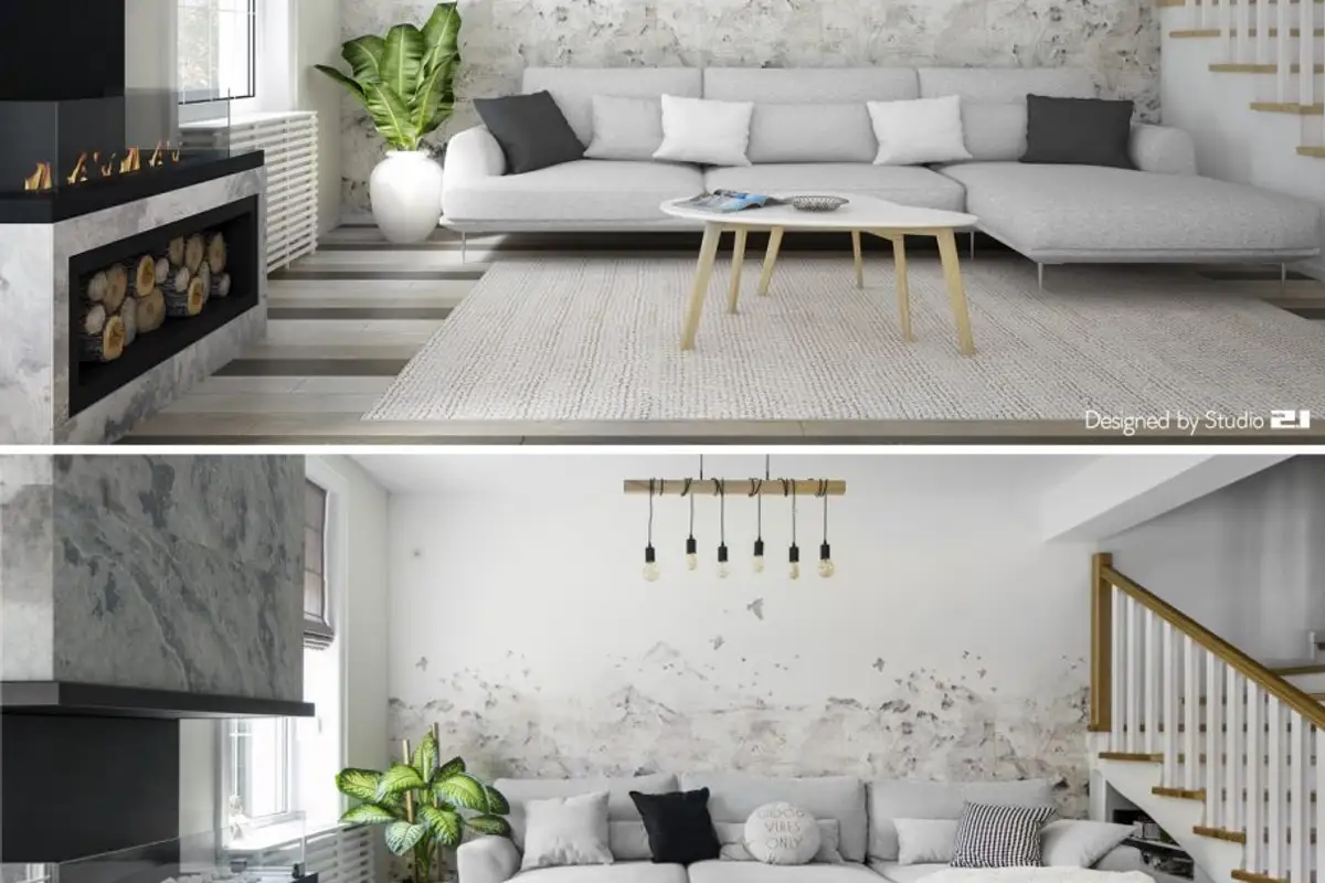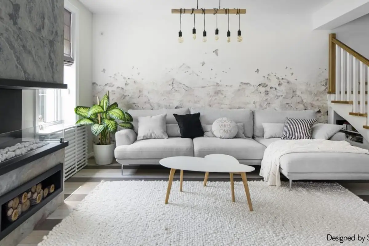Stylistically and chromatically, the arrangement reminds us of Scandinavian interiors, with a palette of neutral shades and small pastel accents. In the same spirit, materials such as slate and wood were chosen, adding soft and fluffy textures, as well as plants to recreate the idea of nature indoors as faithfully as possible.