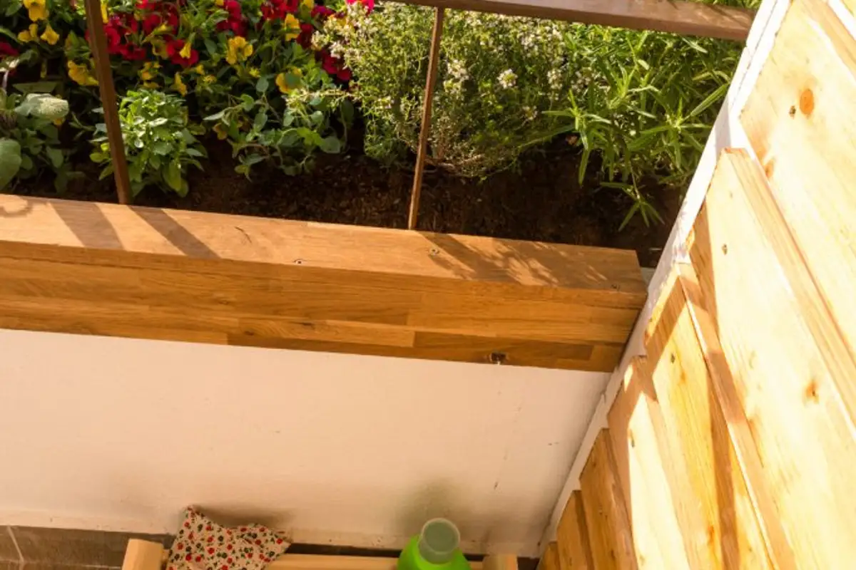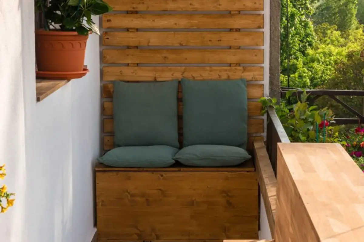 If your balcony follows the pattern of the one arranged with Hornbach products, you can opt for a planter along the railing and a wooden bar, and to obtain even more storage and relaxation space, you can transform a wooden chest into a comfortable bench by adding decorative cushions.