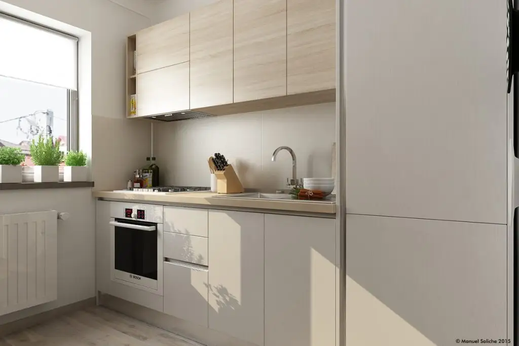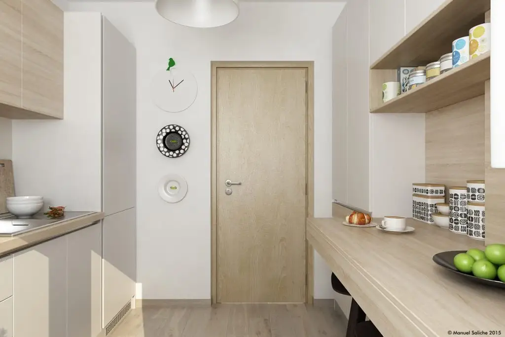 Intrucatbucataria este un spatiu foarte restrans, fiecare zona a fost exploatata in intregime pentru a da o utilitate cat mai mare spatiului; o idee general valabila pentru toata suprafata acestui apartament.