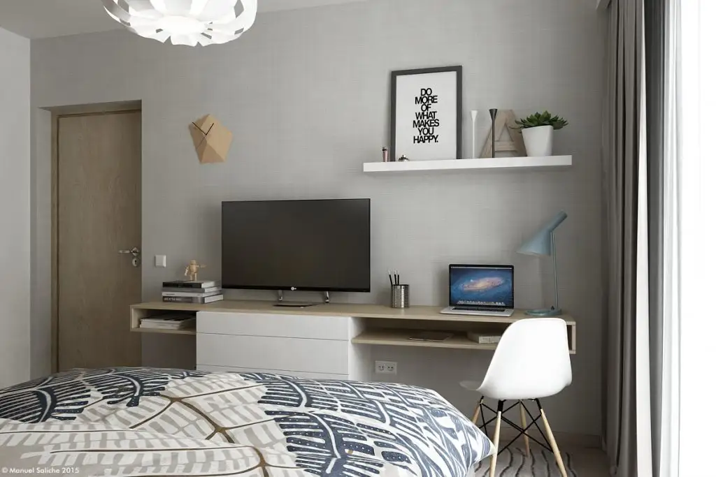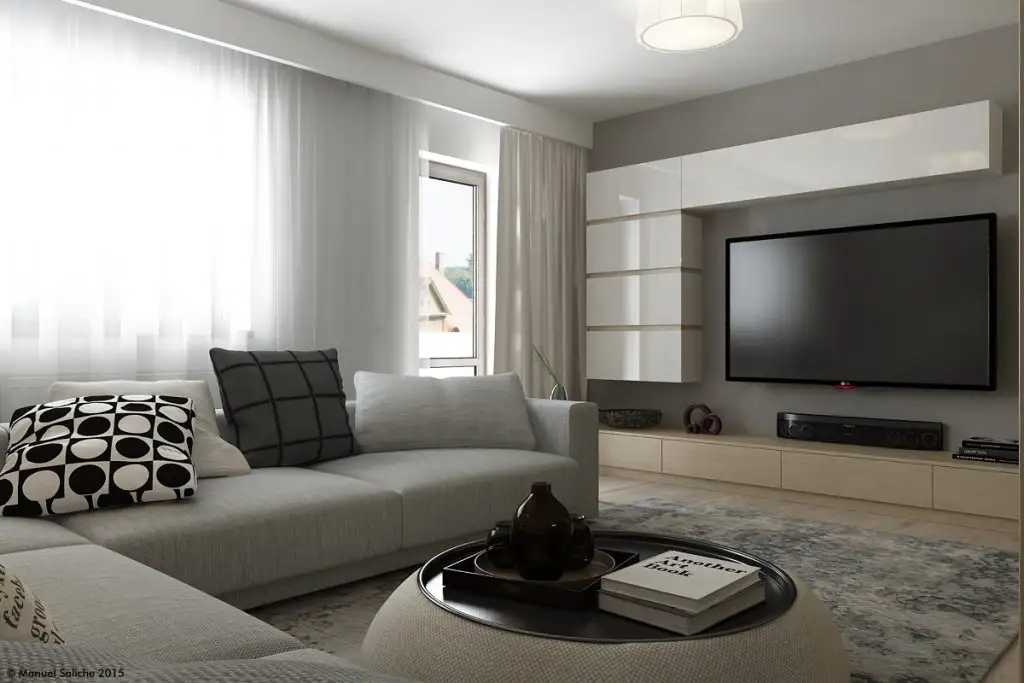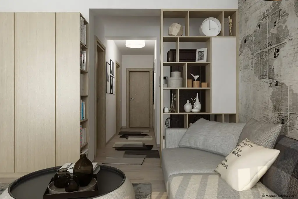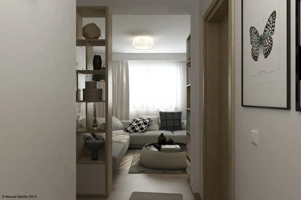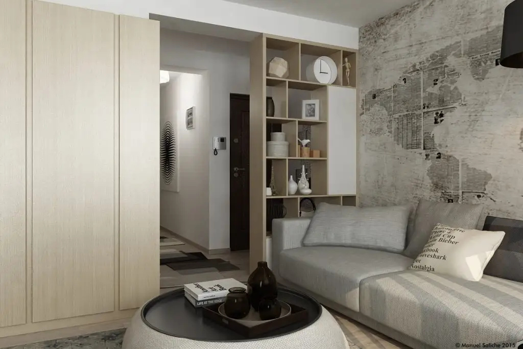 Livingul te cucereste de-a dreptul! Ne place foarte mult cum Manuel a reusit sa-l puna in valoare, transformandu-l intr-un spatiu confortabil si comod. Spatiul acestei camere este deschis cu cel dinspre holul de la intrare si cel dinspre dormitor. Pentru a oferi putina intimitate si a separa vizual functiunile, Manuel a ales sa introduca un paravan prin construirea unui corp cu polite deschise.