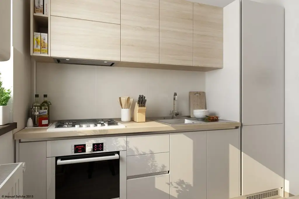 Dat fiind faptul ca singura pozitie a combinei frigorifice era in aceeasi linie cu blatul , reducand din lungimea acestuia, a fost conceput in compozitia mobilierului un blat suplimentar care sa fie folosit atat ca zona de luat masa cat si pentru gatit.
