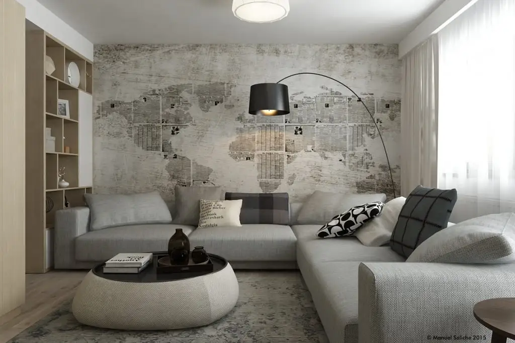 Rezultatul este uimitor! Canapeaua modulara, tip coltar ofera loc suficient pentru a socializa cu prietenii. Pentru a pune zona si mai mult in valoare, creand un centru de interes in incapere, a fost ales un tapet montat pe tot peretele din spatele canapelei. Si cum nimic nu este intamplator, elementul grafic se regaseste intr-o anumita masura si in textura covorului.