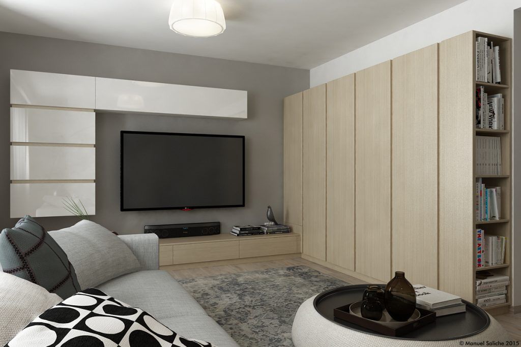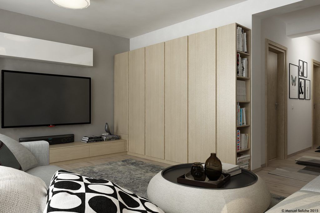 Livingul te cucereste de-a dreptul! Ne place foarte mult cum Manuel a reusit sa-l puna in valoare, transformandu-l intr-un spatiu confortabil si comod. Spatiul acestei camere este deschis cu cel dinspre holul de la intrare si cel dinspre dormitor. Pentru a oferi putina intimitate si a separa vizual functiunile, Manuel a ales sa introduca un paravan prin construirea unui corp cu polite deschise.