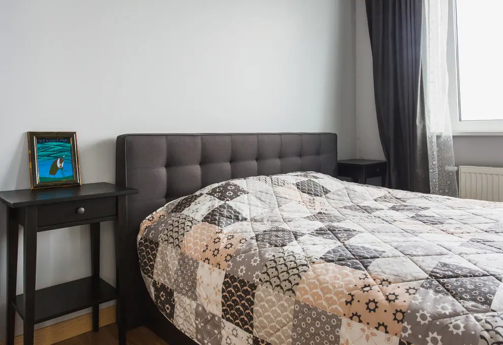 Accesul in dormitorul matrimonial se face direct din camera-living, prin marimea ei usa jucand si rol de partitie. Aici, cel mai important lucru a fost amenajarea unui dressing pentru haine. Spatiul este simplu, patul fiind piesa centrala din camera. Au adaugat o tablie confortabila si doua noptiere de la IKEA.