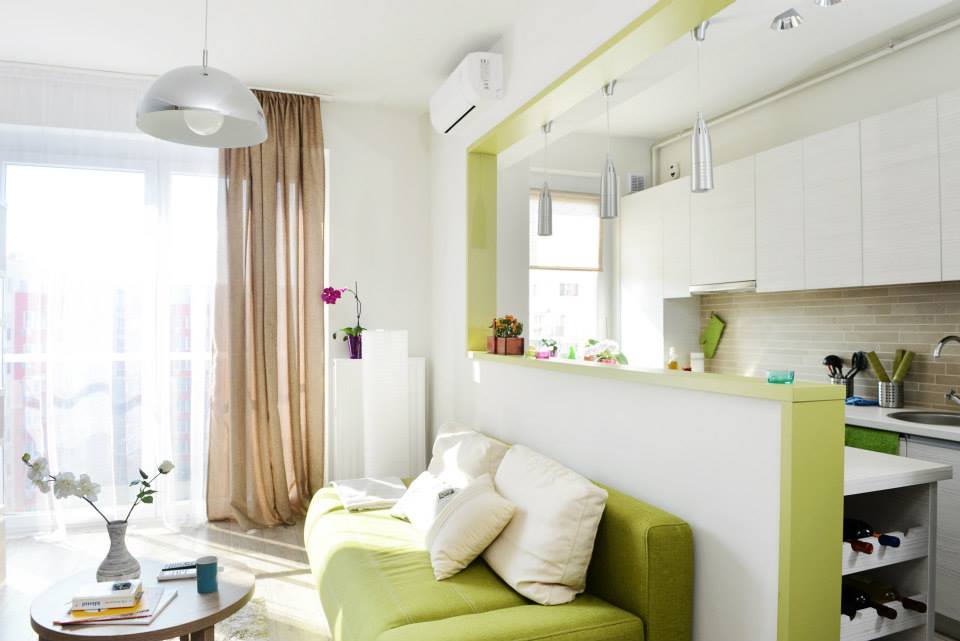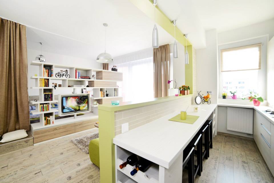 A fost o mare provocare pentru ca si-a dorit ca, dintr-un apartament mic cu suprafata utila de 40 metri patrati, sa rezulte o amenajare care sa aiba toate dotarilede care are nevoie un cuplu, spatii bine delimitate (baie, bucatarie, zona de luat masa, camera de zi, dormitor, zona de studiu) fara a face din el un spatiu inghesuit sau sufocant.