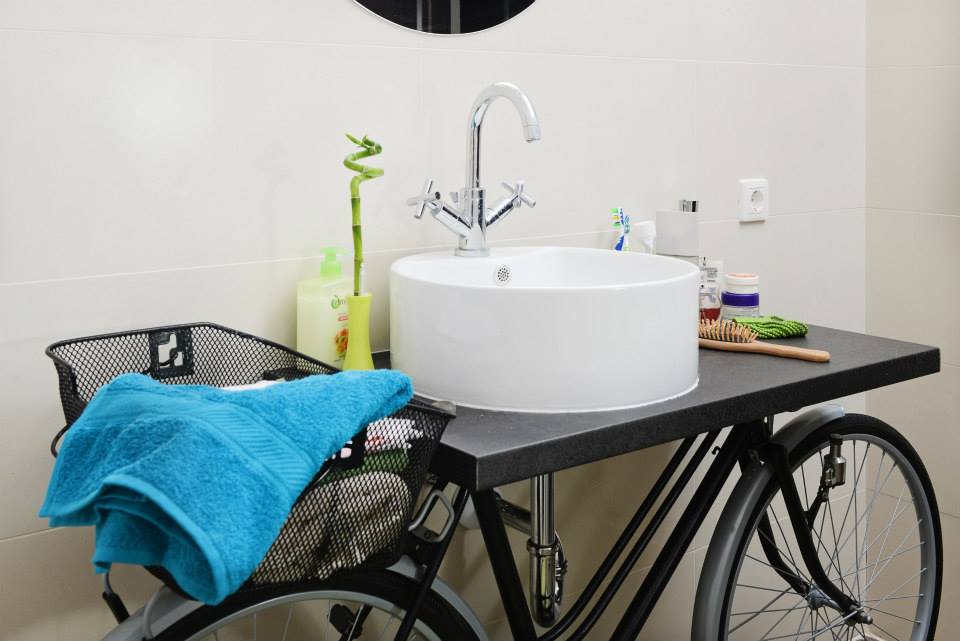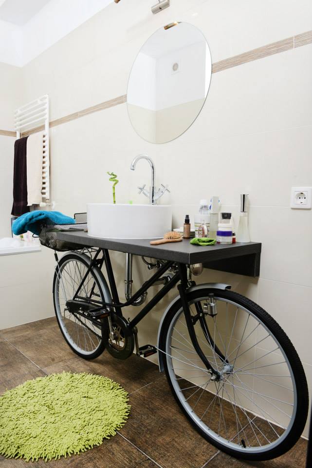 Elementul-surpriza al amenajarii: o bicicleta reconditionata asezata sub lavoar