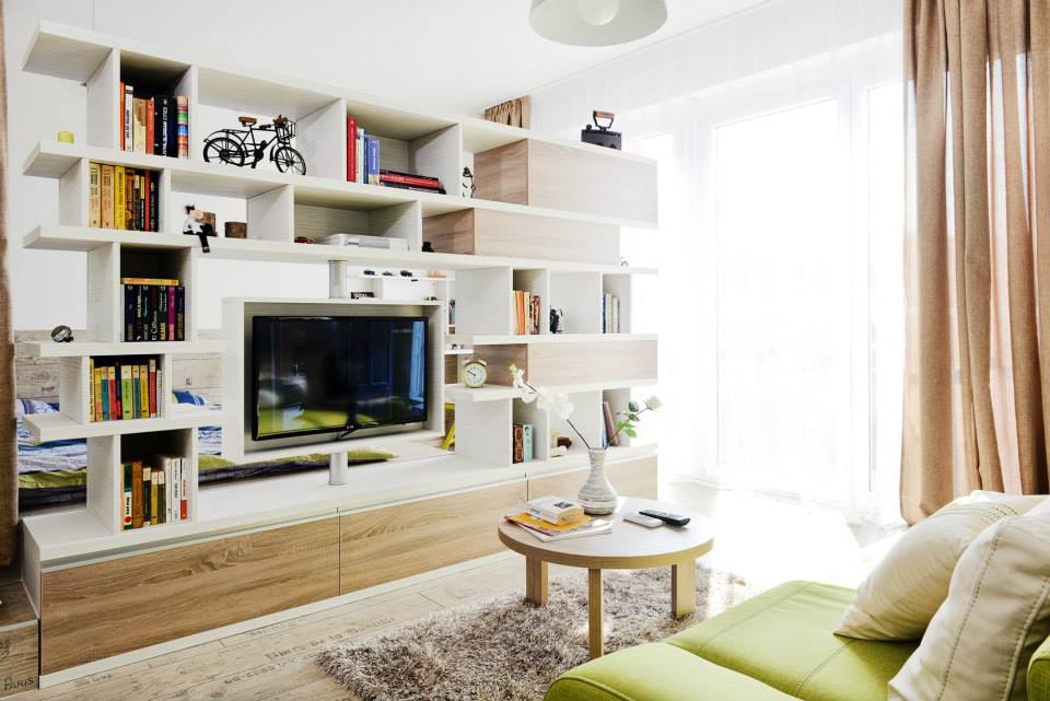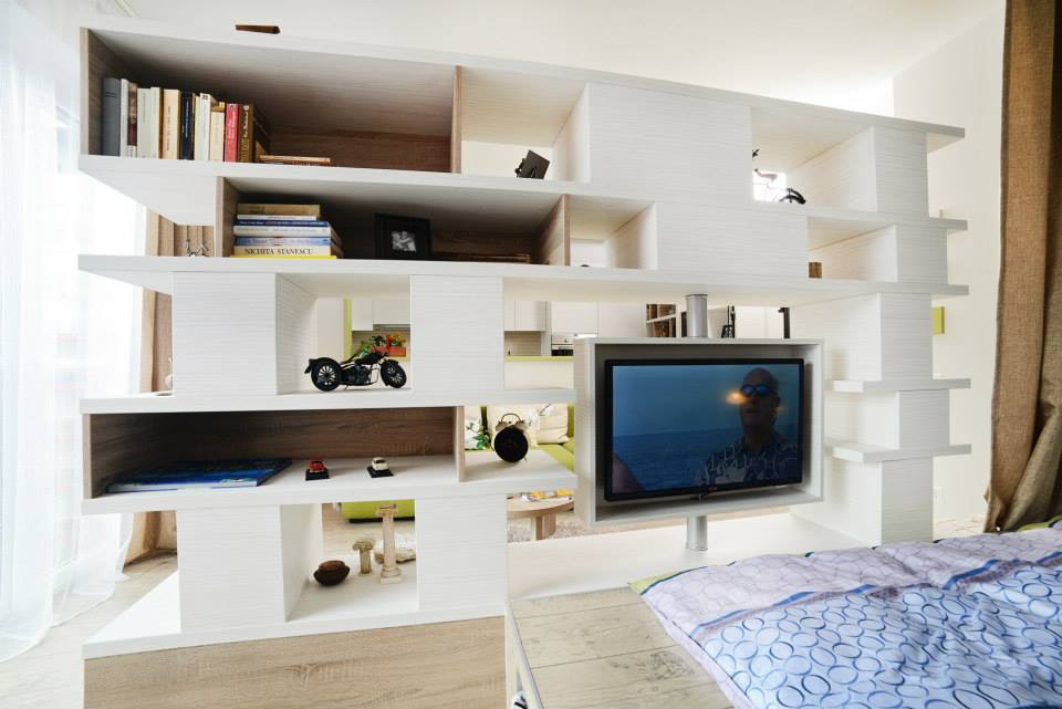 Mobilier cu dubla functie care sa delimiteze zona de zi de cea de noapte (realizat pe comanda)