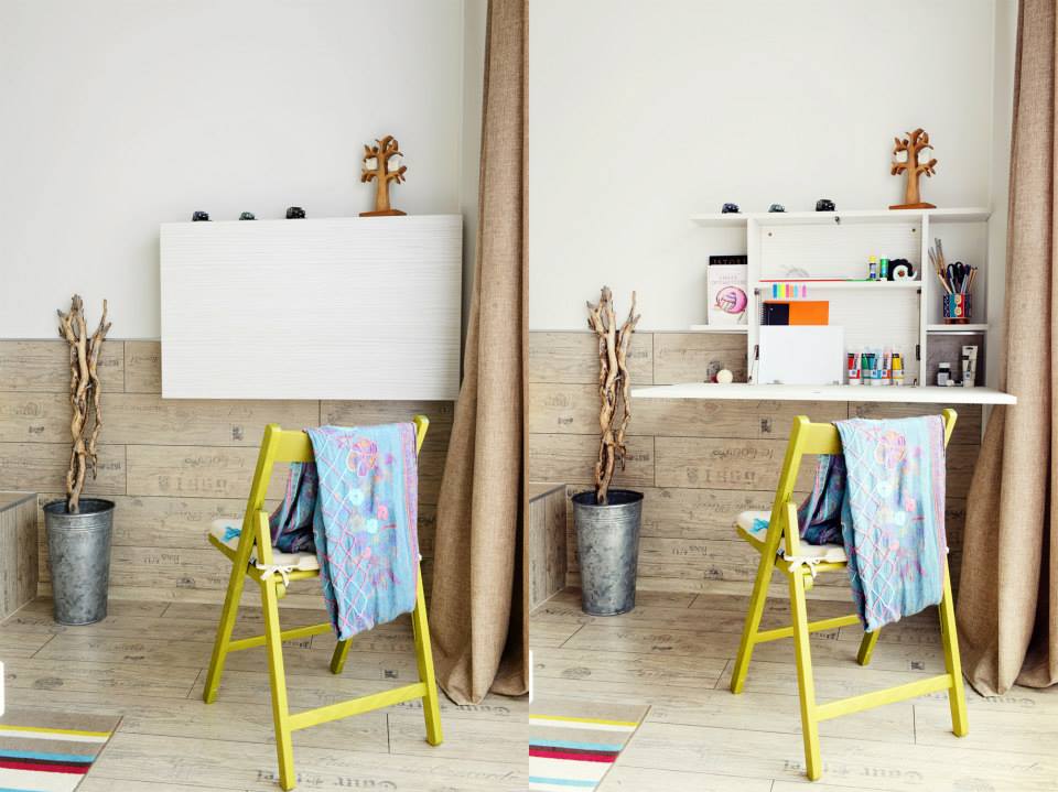 Zona de studiu a fost conturata sub forma unui dulap cu usa ce poate fi folosita pe post de birou la nevoie.