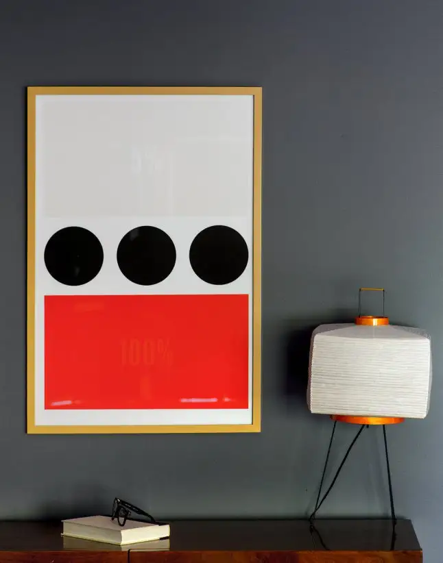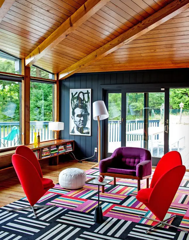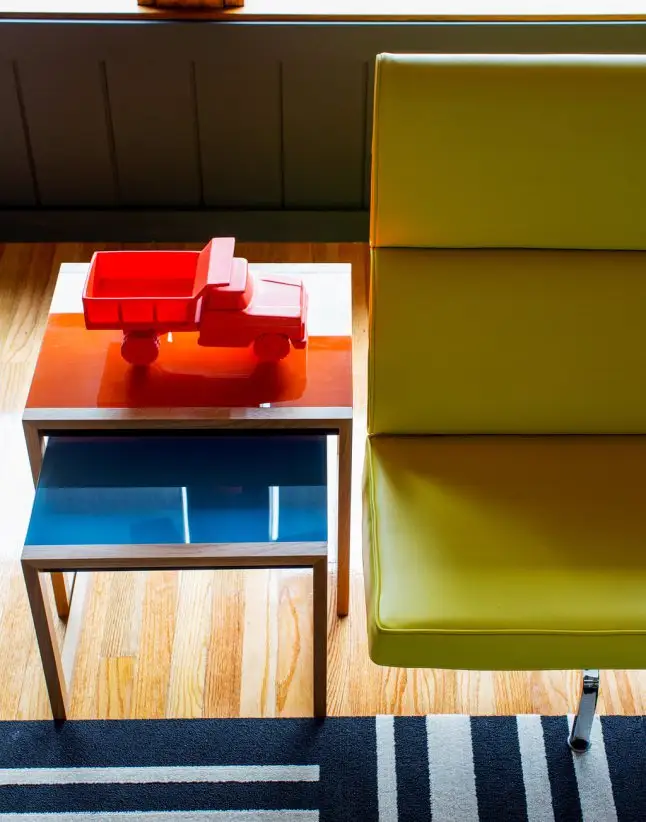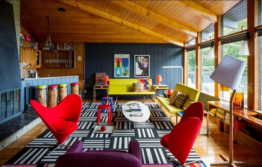 Doua canapele Eames de culoarea bananei, 2 scaune in rosu si albastru purtand semnatura marelui designer scandinav Alvar Aalto, grafisme sub forma tablourilor si doua veioze portocalii, toate reunite sub un covor in dungi proeminente alb-negru pana la jumatate si dungi colorate in cealalta jumatate, asa am putea descrie livingul.