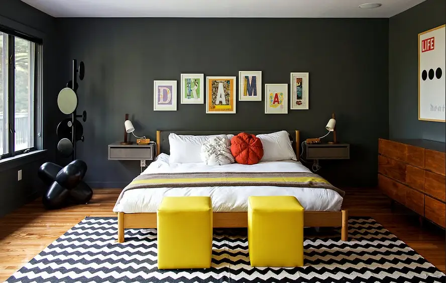 Dormitorul este decorat in acelasi ton al dramatismului. Pereti negri sau bleumarin inchis, elemente decorative inedite, doua pufuri galbene si un covor cu imprimeu in zigzag, iata conturul unei camere pe care cu greu l-ai putea numi zona de odihna. Insa, in aceasta amenajare totul este despre viziunea lui Bradford si un talent veritabil in crearea unor asemenea compozitii neobisnuite.