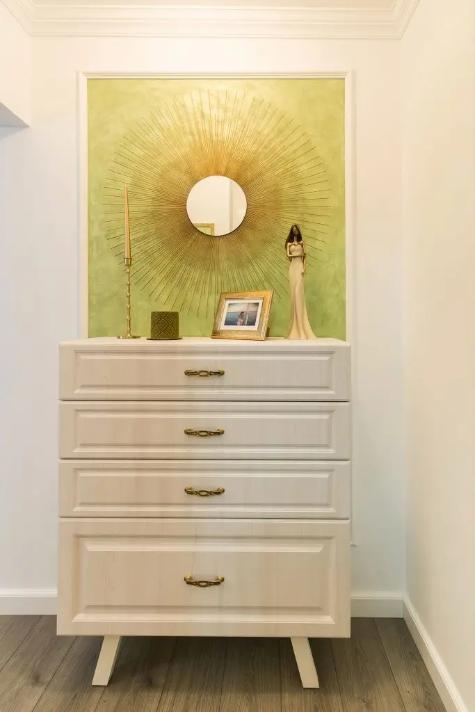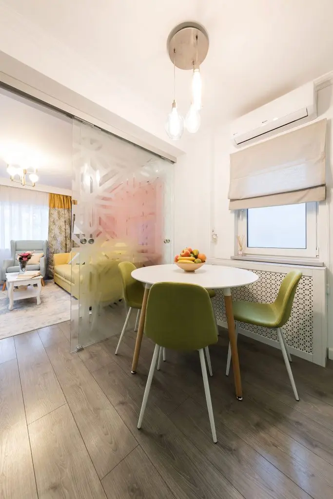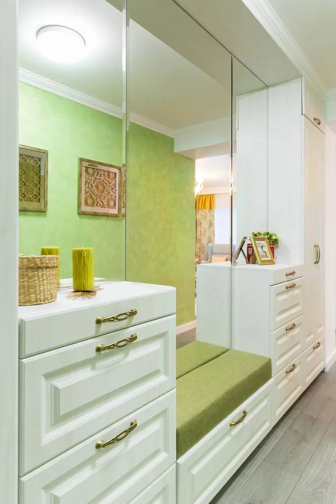 Intreaga lungime a holului este exploatata intr-o maniera functionala prin adaugarea de spatii de depozitare numeroase, o oglinda supradimensionata si un loc pentru sezut. Verdele crud este cel care prinde voce in cazul acestui spatiu de legatura, oferind o imagine proaspata si relaxanta.