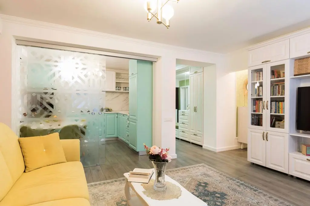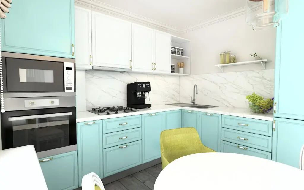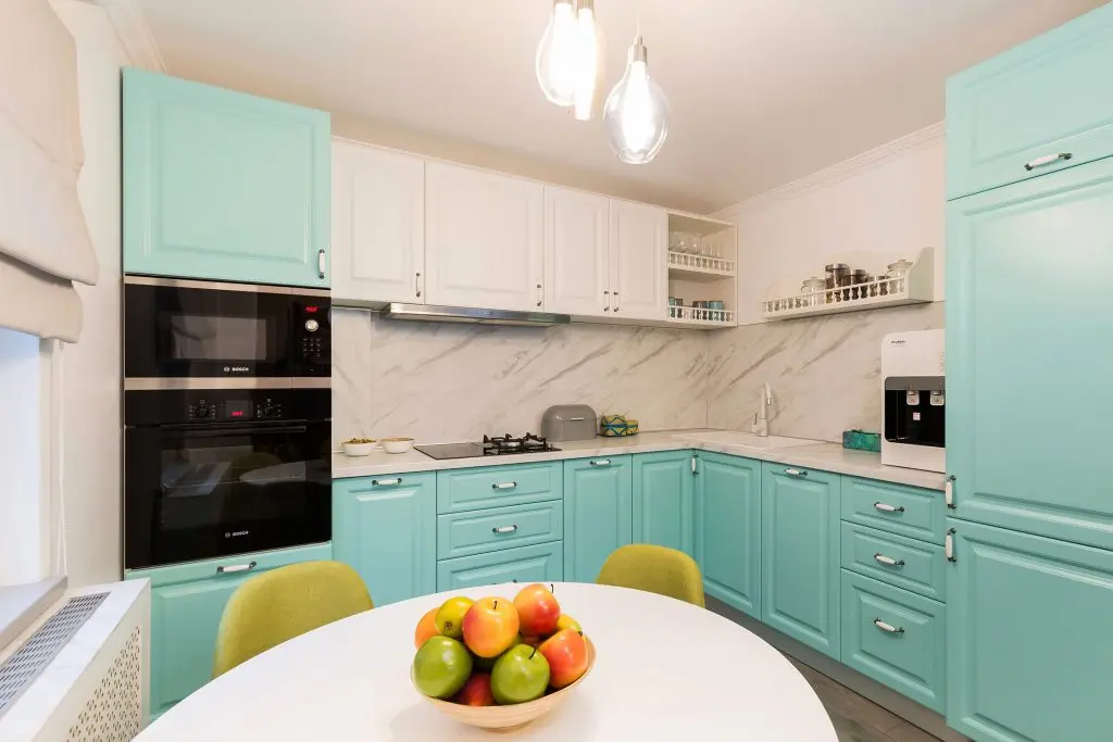 Galbenul varatic, care se evidentiaza in cazul acestei incaperi, se imbina armonios cu turquoise-ul mobilierului bucatariei, spatiu izolat cu ajutorul unui perete din sticla glisant, ce are rol atat de separare, cat si de unificare a celor doua camere. Melancolia epocii romantice se resimte si in cazul bucatariei prin intermediul detaliilor cu care vine moblierul: manere, rafturi, contur. Locul de servire a mesei este accentul de modernitate si asta datorita design-ului confortabil al scaunelor. La toate acestea se adauga si electrocasnicele de ultima generatie.