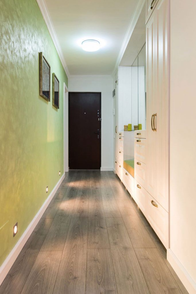 Intreaga lungime a holului este exploatata intr-o maniera functionala prin adaugarea de spatii de depozitare numeroase, o oglinda supradimensionata si un loc pentru sezut. Verdele crud este cel care prinde voce in cazul acestui spatiu de legatura, oferind o imagine proaspata si relaxanta.