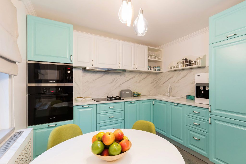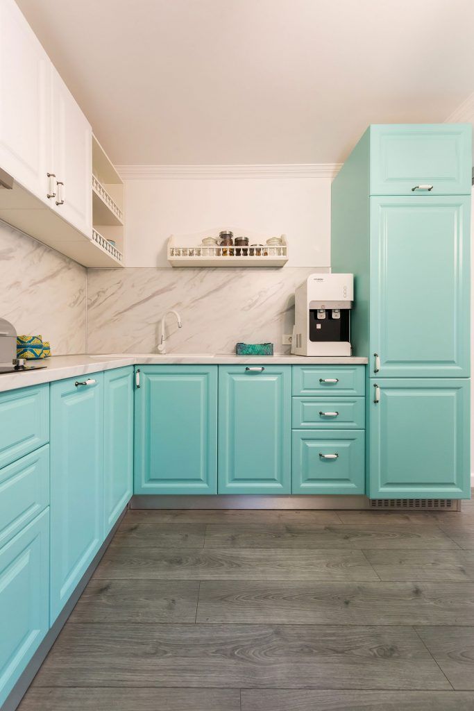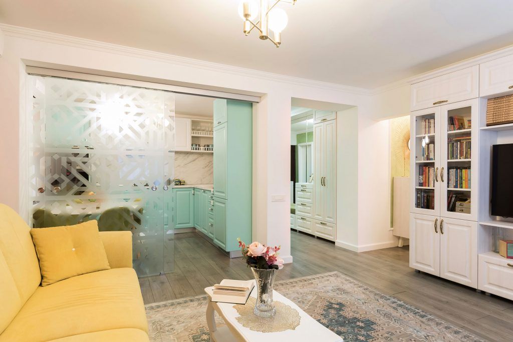 Galbenul varatic, care se evidentiaza in cazul acestei incaperi, se imbina armonios cu turquoise-ul mobilierului bucatariei, spatiu izolat cu ajutorul unui perete din sticla glisant, ce are rol atat de separare, cat si de unificare a celor doua camere. Melancolia epocii romantice se resimte si in cazul bucatariei prin intermediul detaliilor cu care vine moblierul: manere, rafturi, contur. Locul de servire a mesei este accentul de modernitate si asta datorita design-ului confortabil al scaunelor. La toate acestea se adauga si electrocasnicele de ultima generatie.