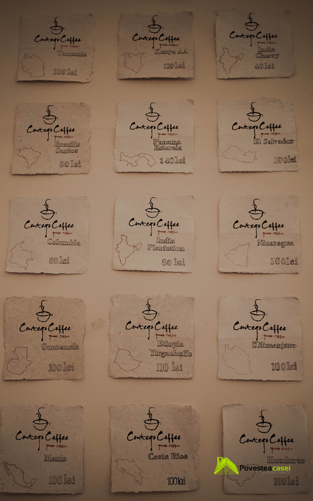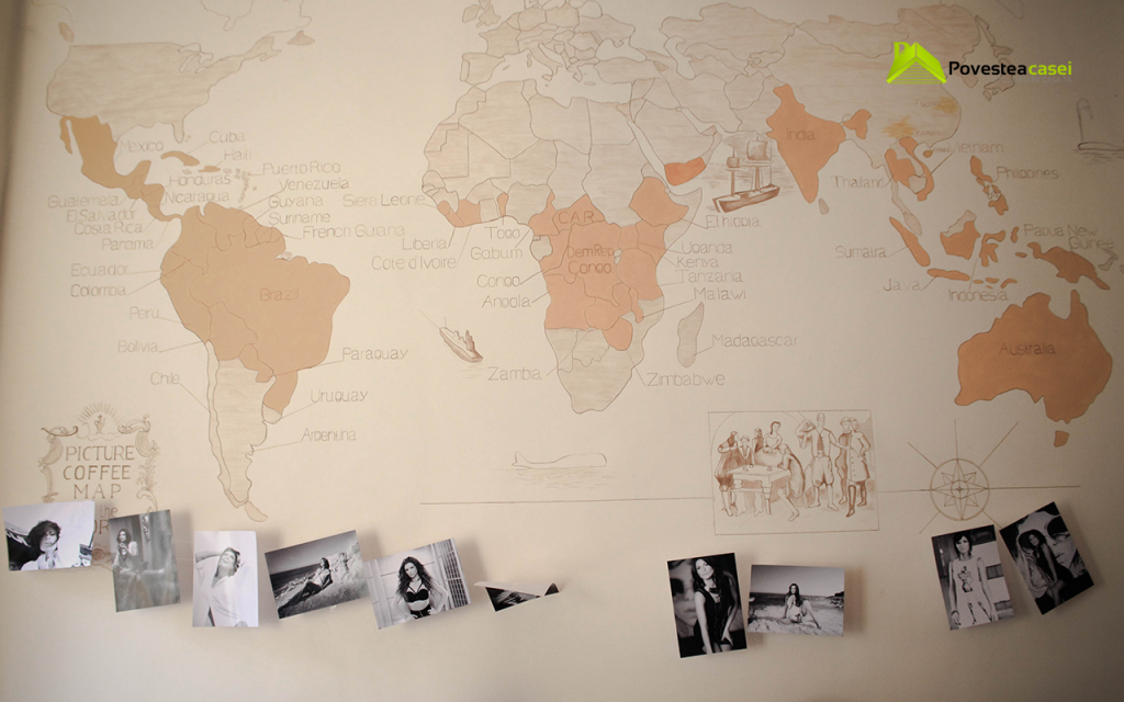 In timp ce am savurat o ceasca cu aceasta minunata licoare datatoare de energie am putut admira cu interes o harta a zonelor unde se cultiva cele mai bune sortimente de cafea, aceasta fiind desenata pe un intreg perete.