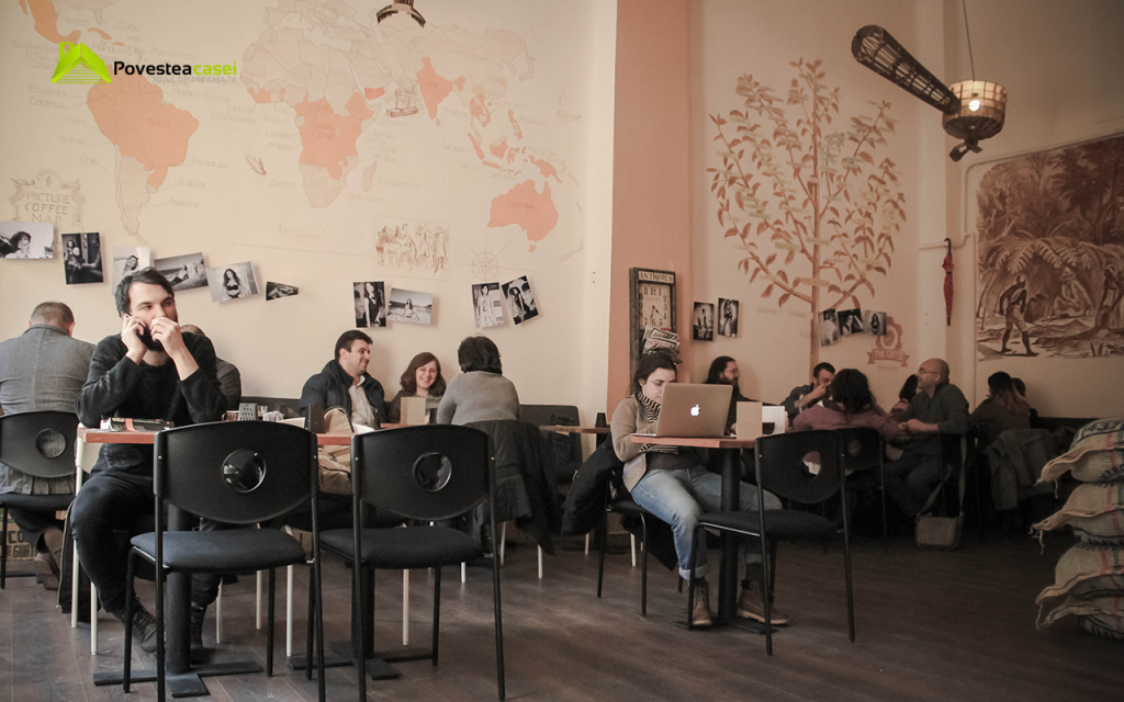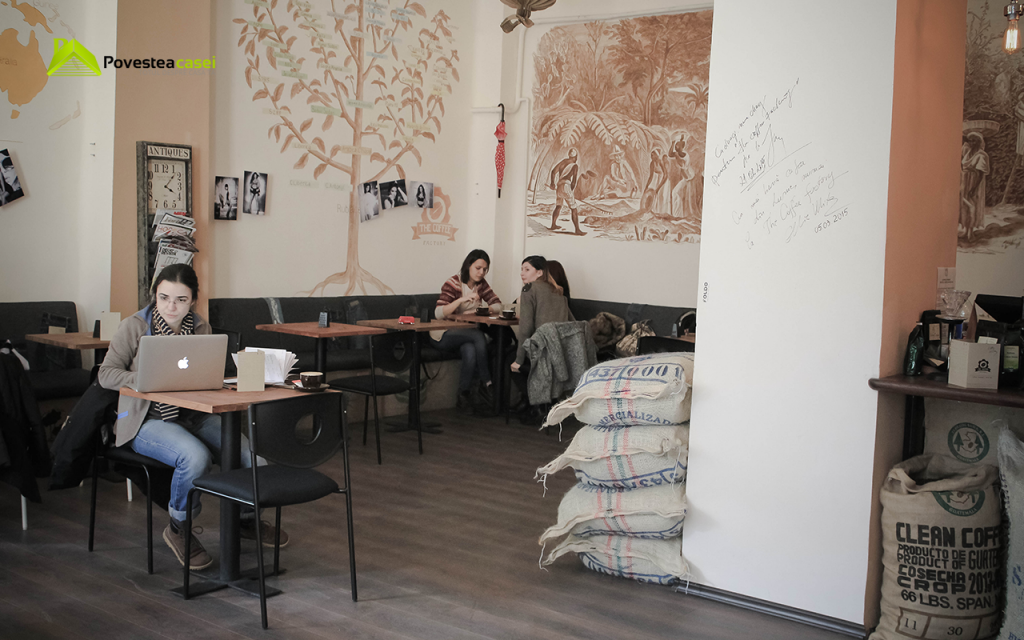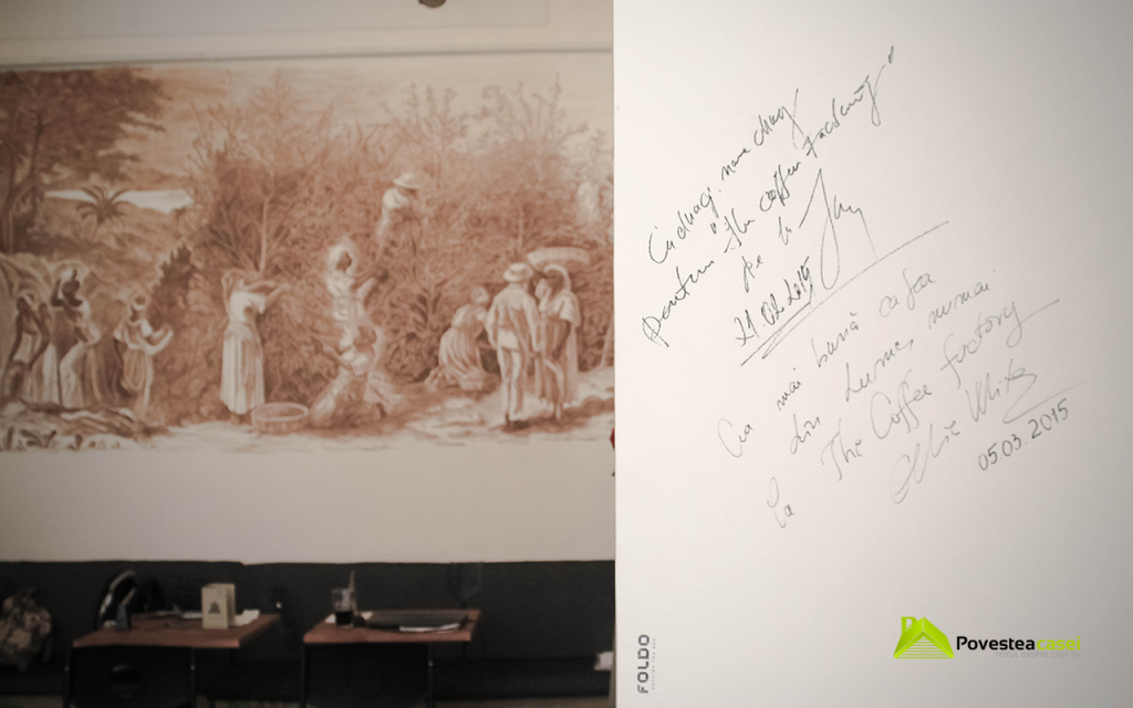 Stefan Iordache, cel care detine The Coffee Factory, este si cel care s-a ocupat de designul interior. Pasiunea sa pentru cafea si numeroasele calatorii pe care le-a facut in intreaga lume i-au folosit ca surse de inspiratie. El ne-a explicat in amanunt fiecare parte a desenelor uriase de pereti, iar toate au legatura, bineinteles, cu cafeaua.