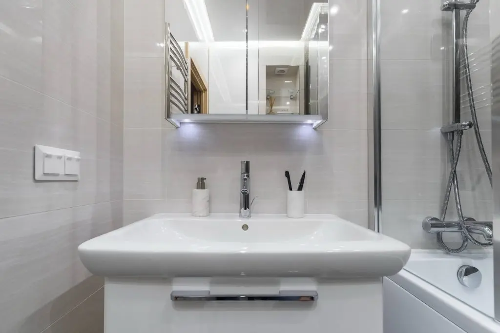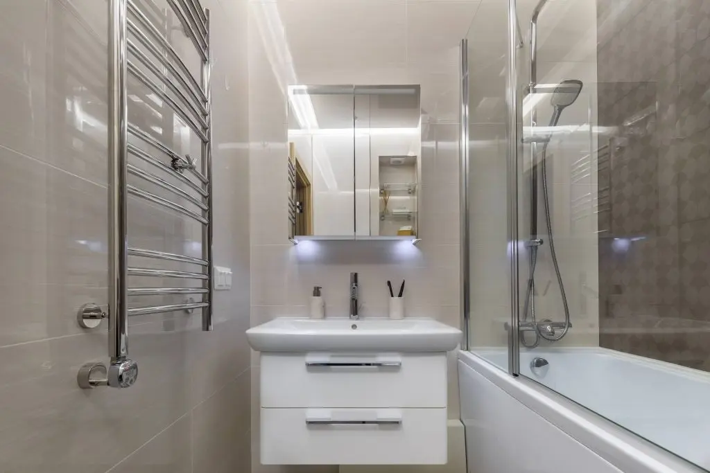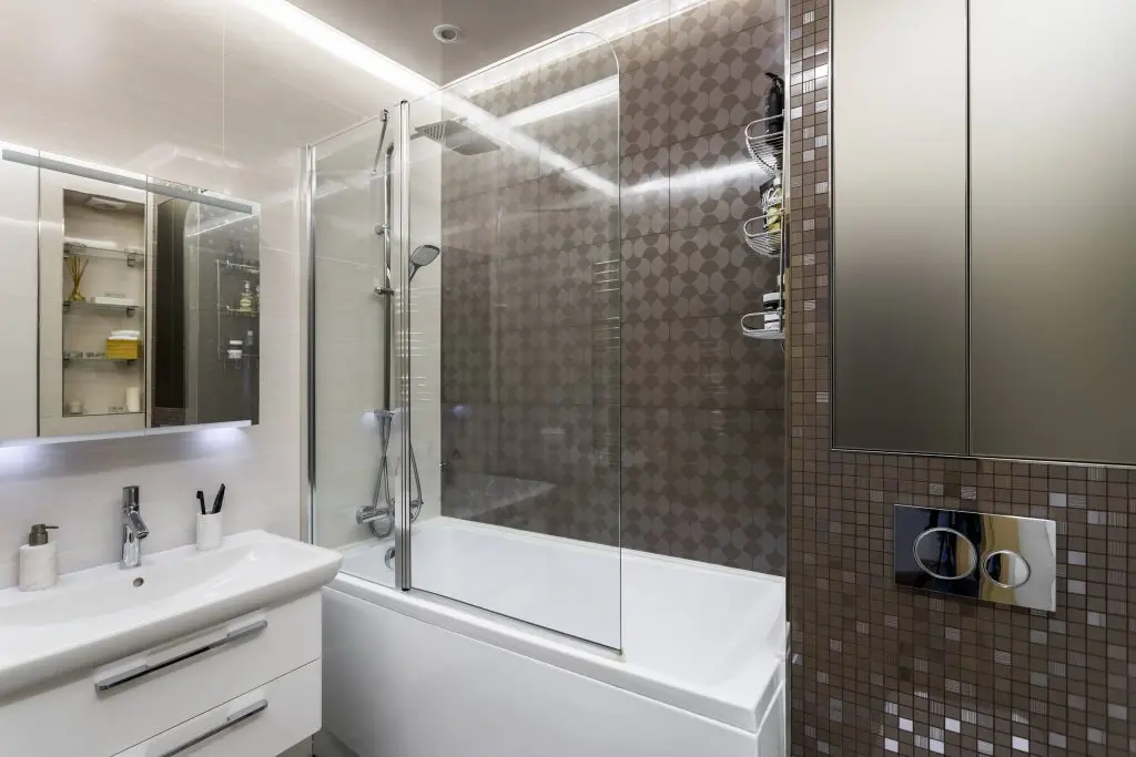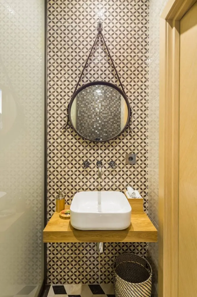 O multitudine de patternuri geometrice invaluie intreaga suprafata a celor doua bai unde, pentru a nu incarca si mai mult vizual, se apeleaza la folosirea argintiului si sticlei ca si elemente constitutive.