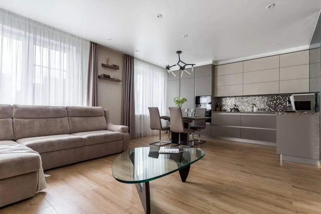 Deschide GaleriaLiving-ul si bucataria formeaza impreuna un open space de dimensiuni impresionante unde accentele de lemn natural, beige, piele si catifea se completeaza perfect cu tapetul din zona mobilierului bucatariei, tapet care iese in evidenta datorita texturii argintii cu aer disco.