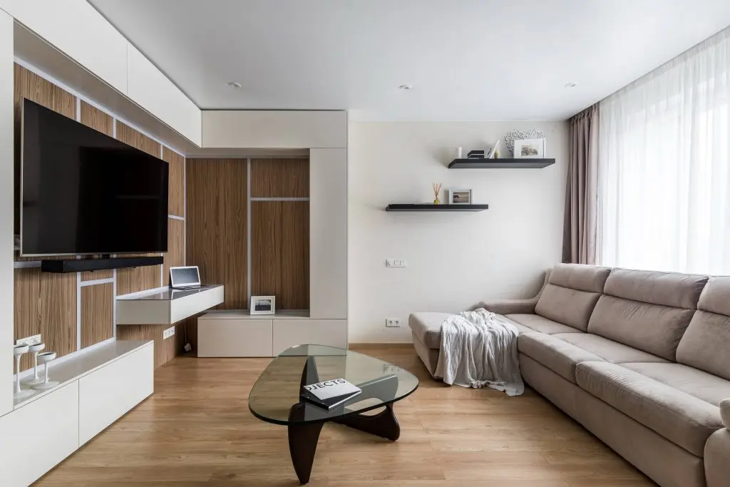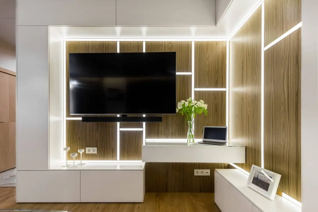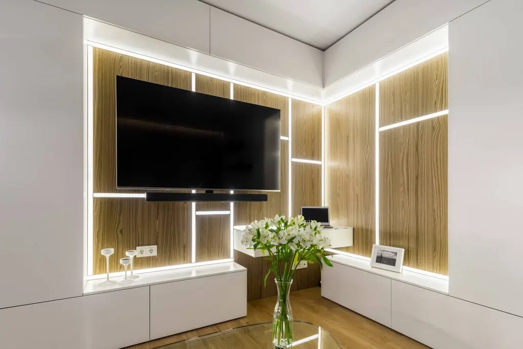 Punctul de atractie al amenajarii acestui spatiu deschis este fara dar si poate asezarea geometrica a benzilor de led incastrate in peretele ce adaposteste biblioteca minimalista si televizorul. Odata aprinse, lumina acestora va fi reflectata de pattern-ul tapetului argintiu, obtinandu-se astfel o atmosfera romantica si moderna in acelasi timp.