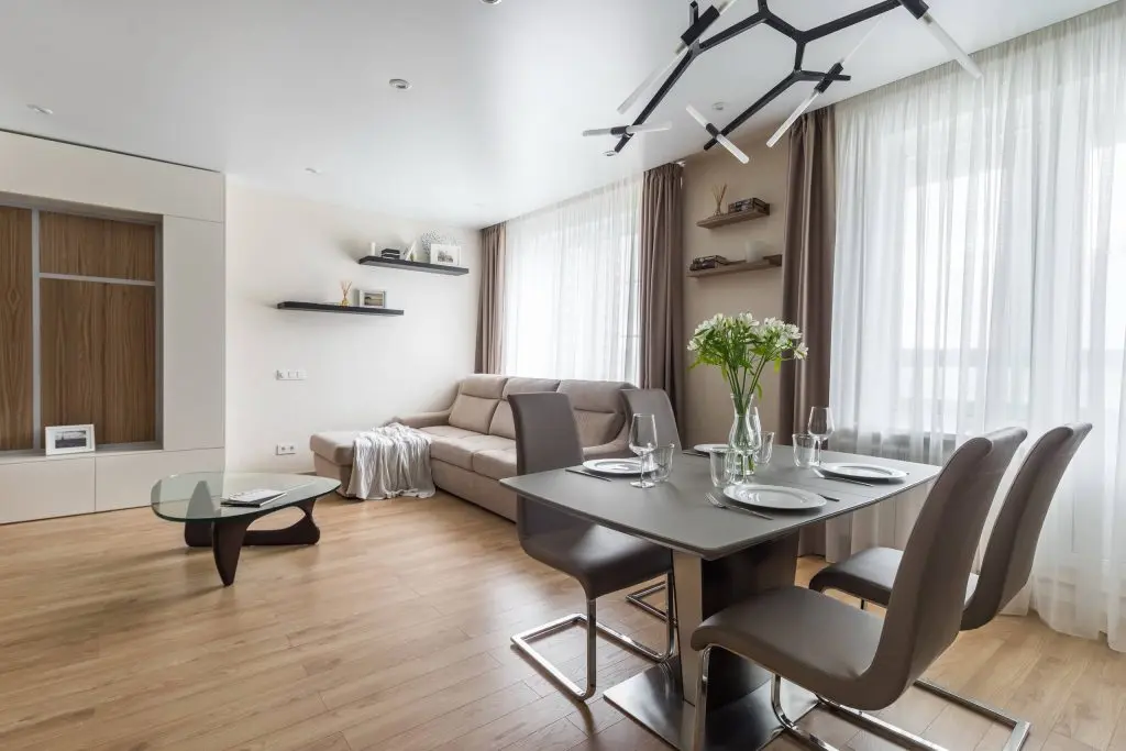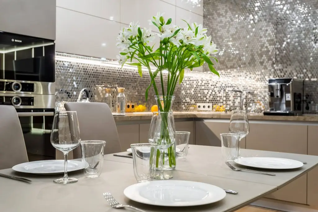 Cu un aspect futurist, spatiul dedicat pregatirii si servirii mesei aduce in prim plan un mobilier minimalist in nuante derivate de mochaccino. Delimitarea de zona de relaxare se face cu ajutorul unei mese simpliste in jurul careia se aseaza 4 scaune moderne, tapitate cu piele.