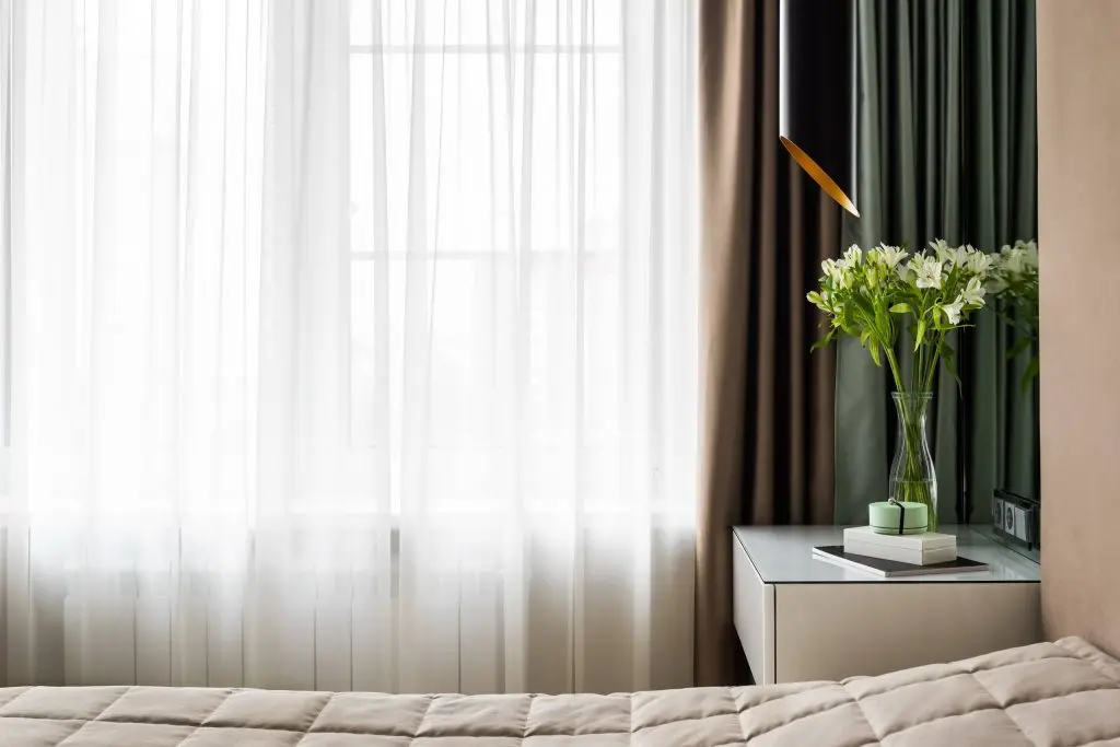 Accentele moderne sunt date de corpurile de iluminat abstracte ce pornesc din tavan si se pozitioneaza pe lateralele patului, oglinzile asezate pe inaltime si design-ul noptierelor incastrate in acestea. Adaugarea verdelui natural in compozitia vizuala a camerei ofera naturalete si incalzeste din punct de vedere vizual intreaga atmosfera conturata.