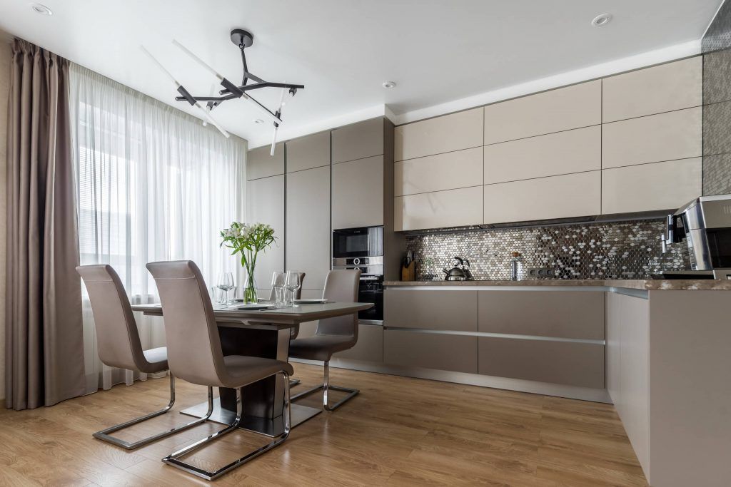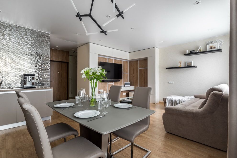 Cu un aspect futurist, spatiul dedicat pregatirii si servirii mesei aduce in prim plan un mobilier minimalist in nuante derivate de mochaccino. Delimitarea de zona de relaxare se face cu ajutorul unei mese simpliste in jurul careia se aseaza 4 scaune moderne, tapitate cu piele.