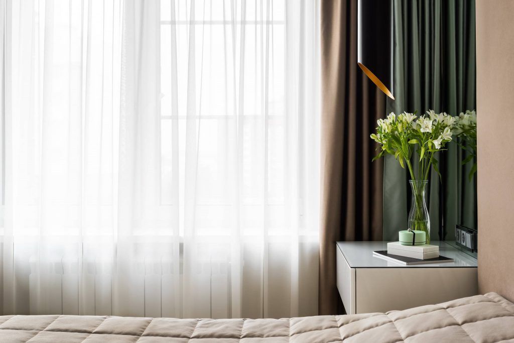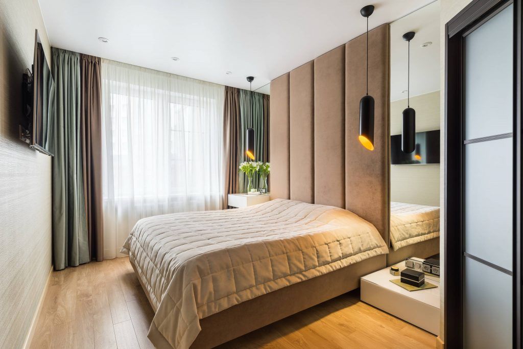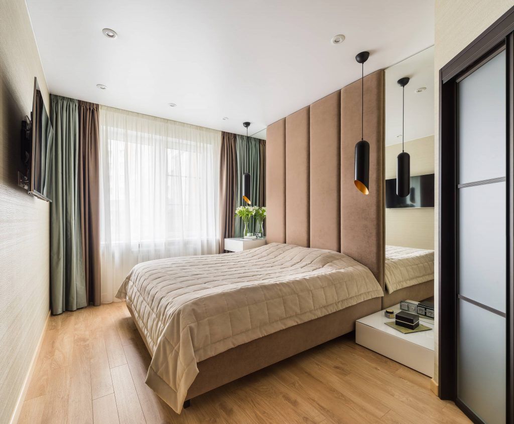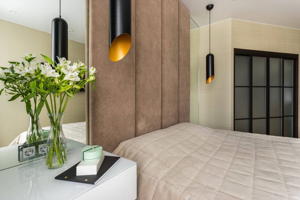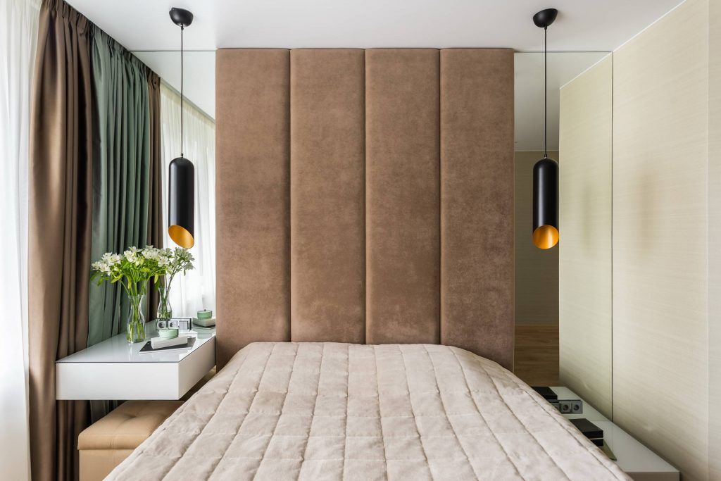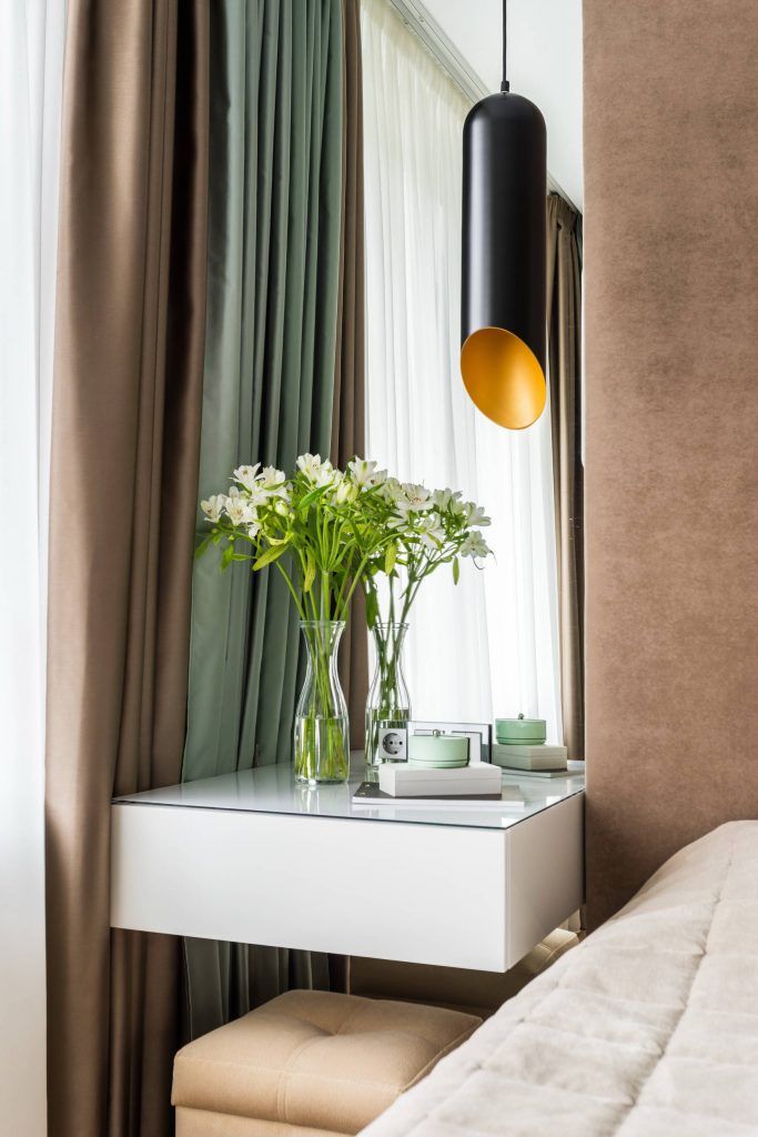 Accentele moderne sunt date de corpurile de iluminat abstracte ce pornesc din tavan si se pozitioneaza pe lateralele patului, oglinzile asezate pe inaltime si design-ul noptierelor incastrate in acestea. Adaugarea verdelui natural in compozitia vizuala a camerei ofera naturalete si incalzeste din punct de vedere vizual intreaga atmosfera conturata.