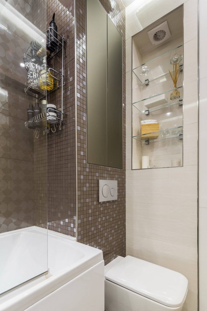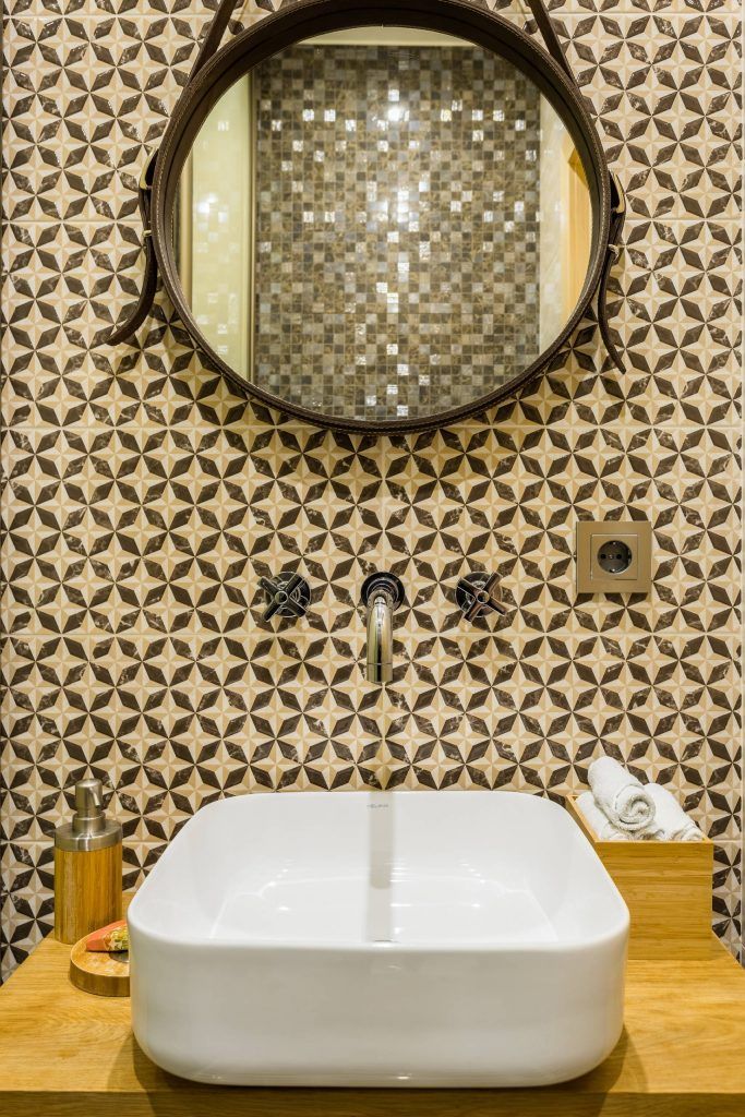 O multitudine de patternuri geometrice invaluie intreaga suprafata a celor doua bai unde, pentru a nu incarca si mai mult vizual, se apeleaza la folosirea argintiului si sticlei ca si elemente constitutive.