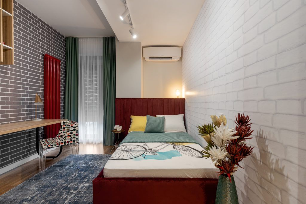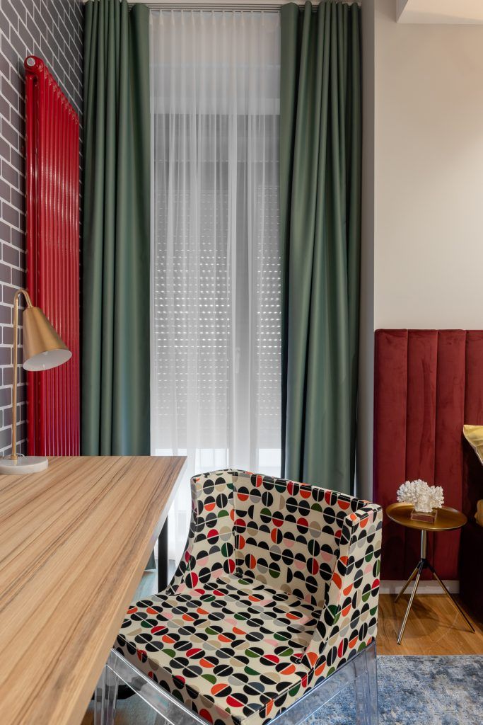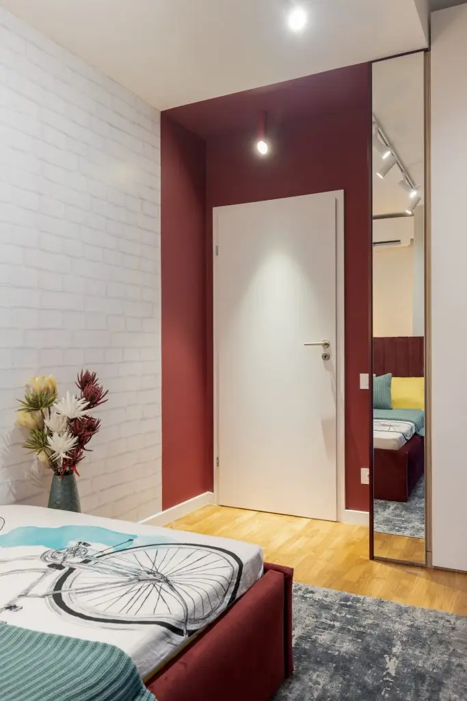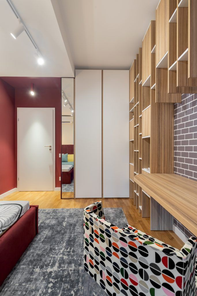 Conform spuselor arhitectului, provocarea cea mai mare a fost inglobarea tuturor elementelor dorite de catre beneficiari in amenajarea propusa fara a sufoca spatiul. Alaturi de fototapetul in culori vii si curajoase, intalnim piese de mobilier placate cu sticla neagra, efectul obtinut fiind unul extrem de elegant si placut: camera pare mai mare si lipsita de monotonie.