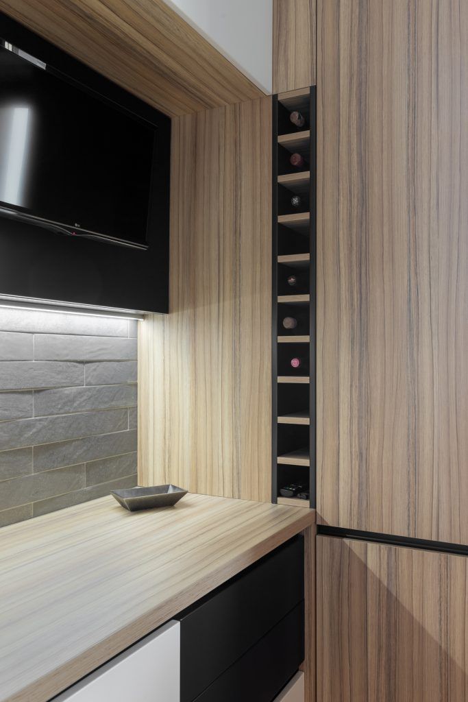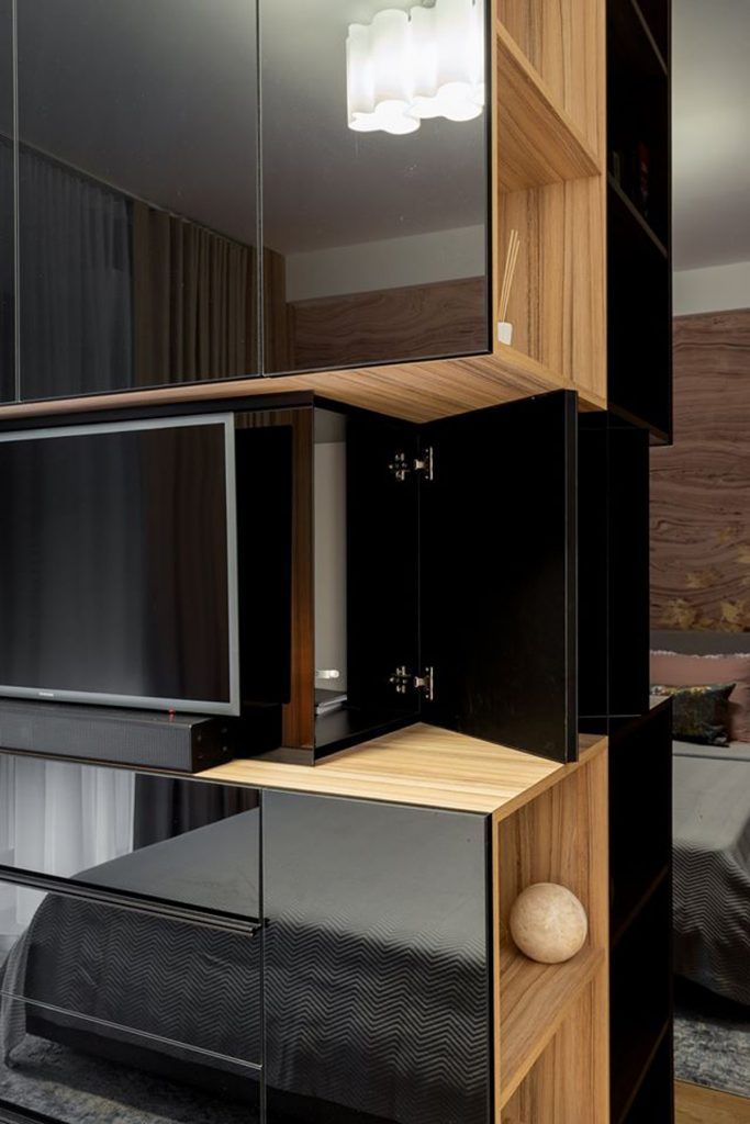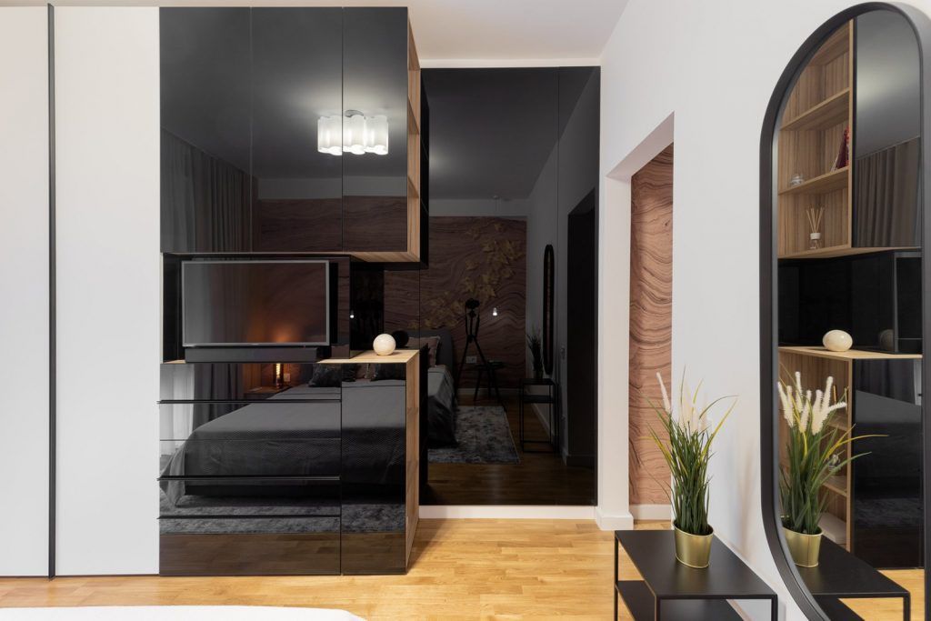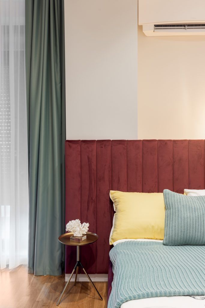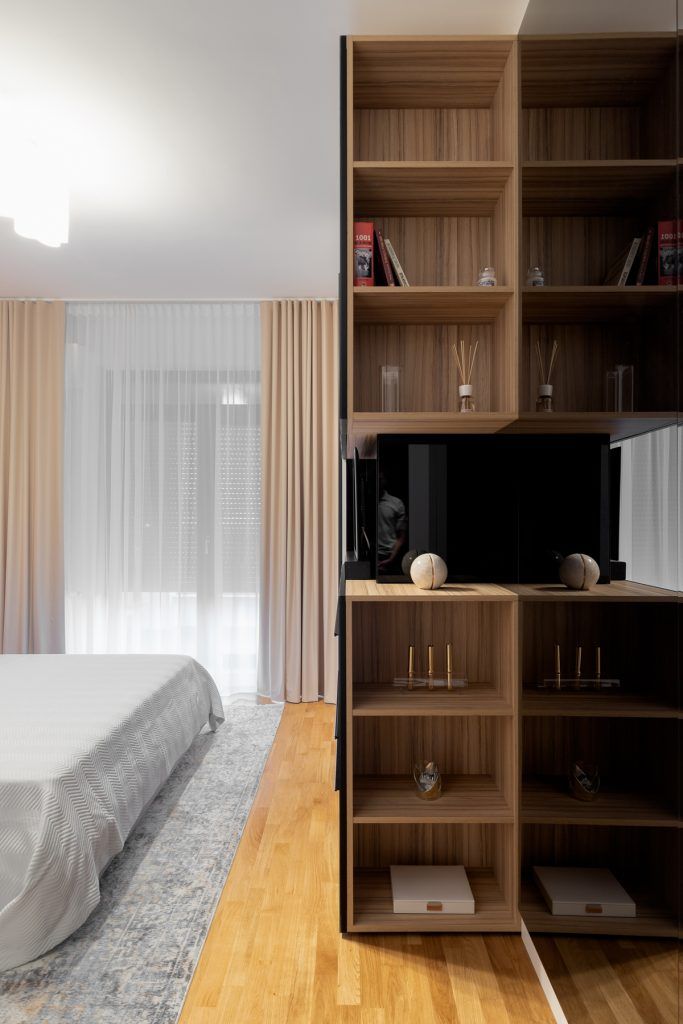 Conform spuselor arhitectului, provocarea cea mai mare a fost inglobarea tuturor elementelor dorite de catre beneficiari in amenajarea propusa fara a sufoca spatiul. Alaturi de fototapetul in culori vii si curajoase, intalnim piese de mobilier placate cu sticla neagra, efectul obtinut fiind unul extrem de elegant si placut: camera pare mai mare si lipsita de monotonie.