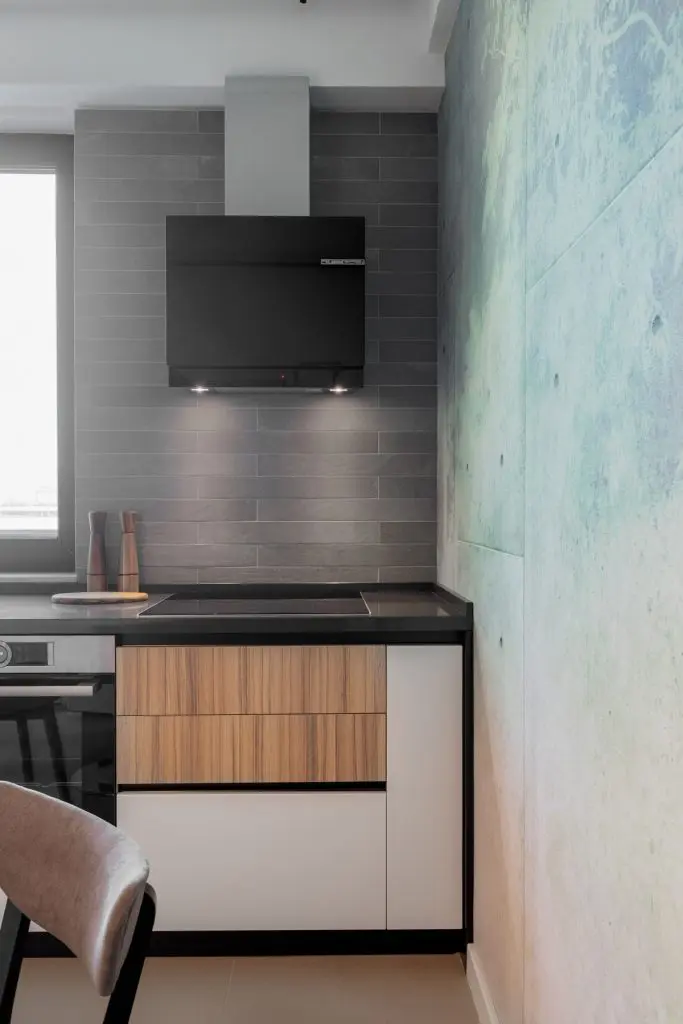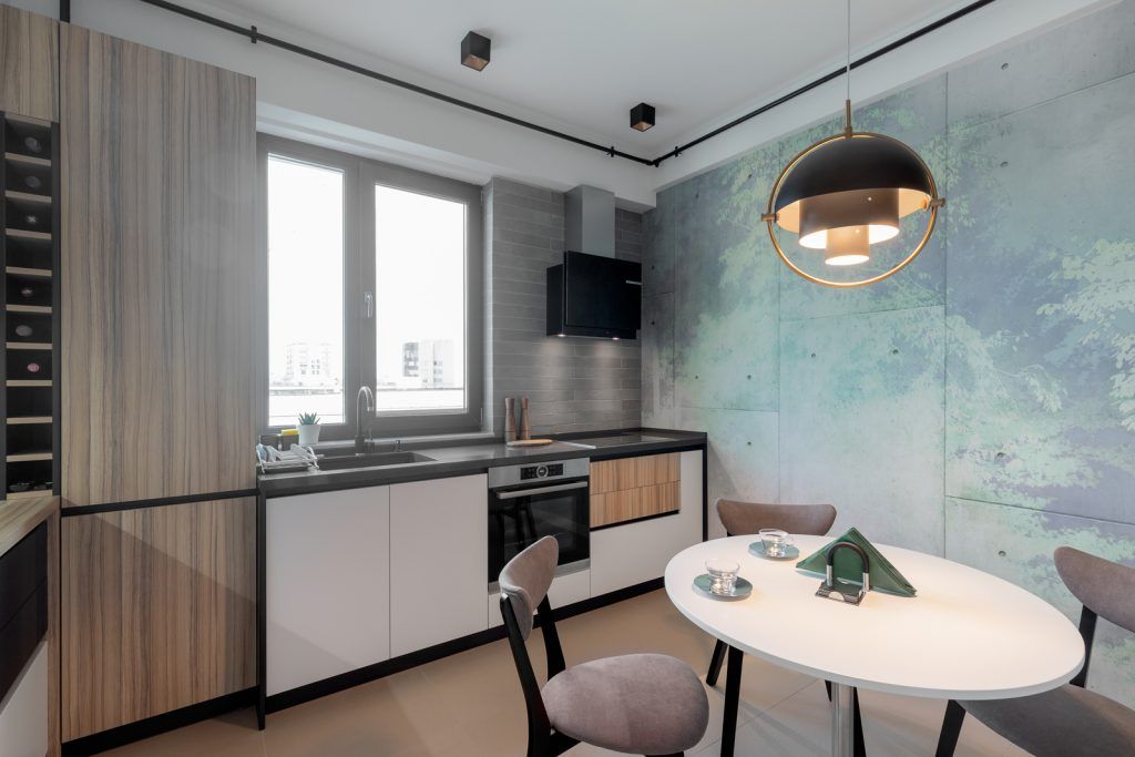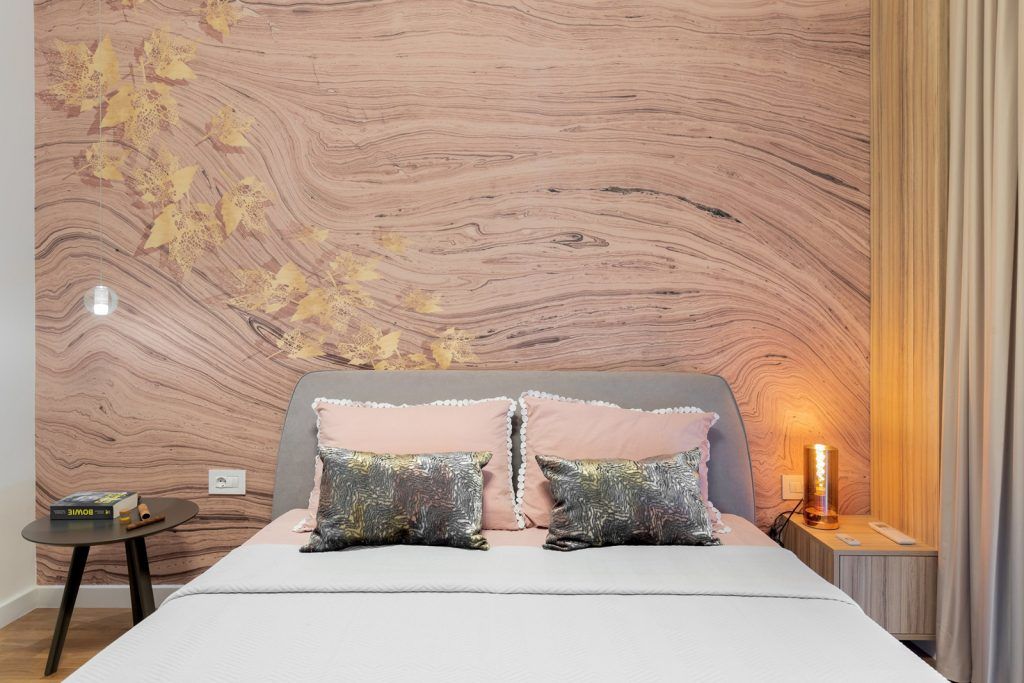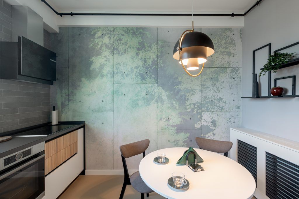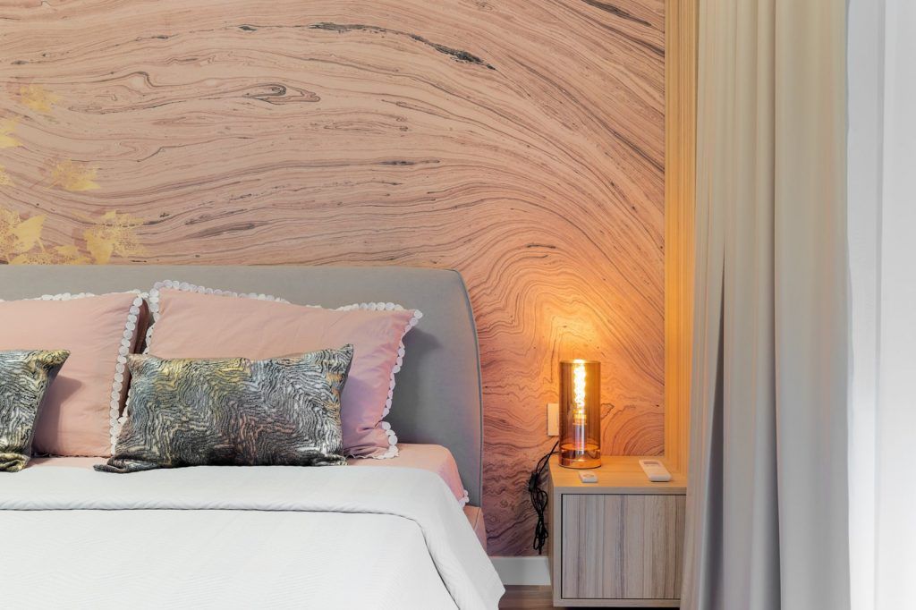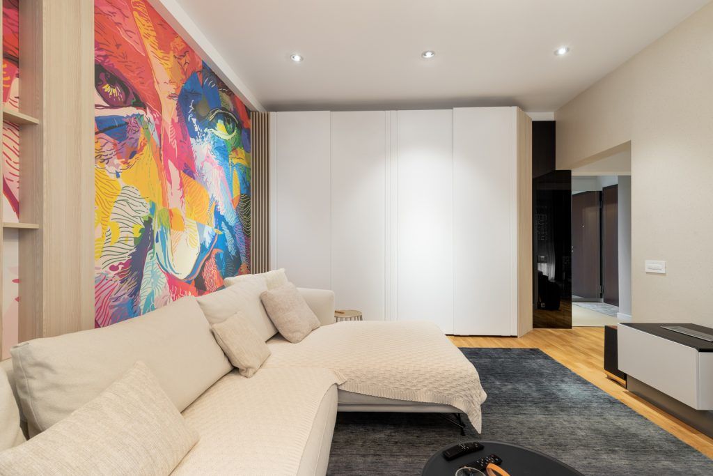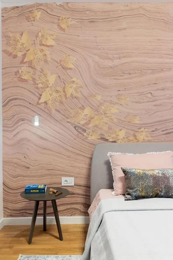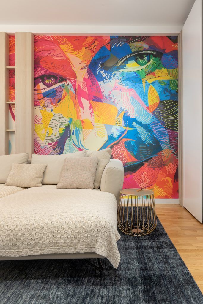 Fototapetul ca finisaj de baza la pereti este o parte integranta a conceptului atat ca solutie estetica dar mai ales din punct de vedere tehnic, pentru a acoperi mai rapid si usor imperfectiunile peretilor. Folosind tapet in culori si patternuri indraznete, au fost create capete de perspectiva impresionante.