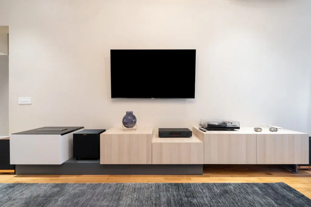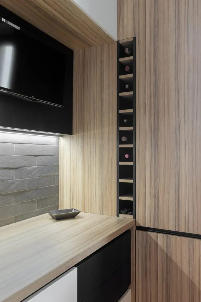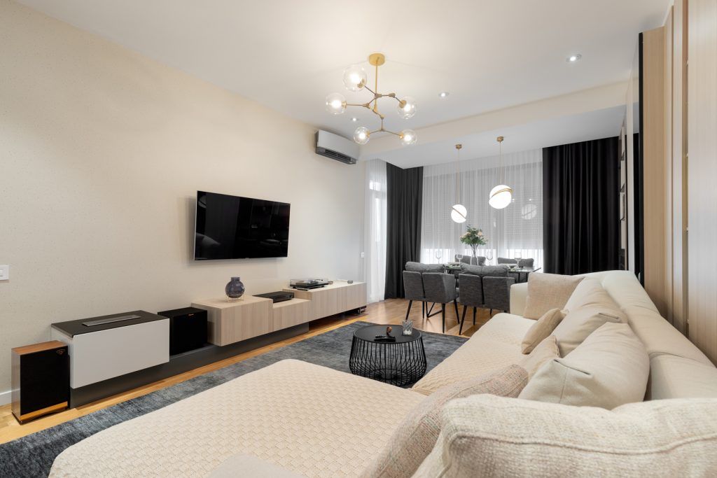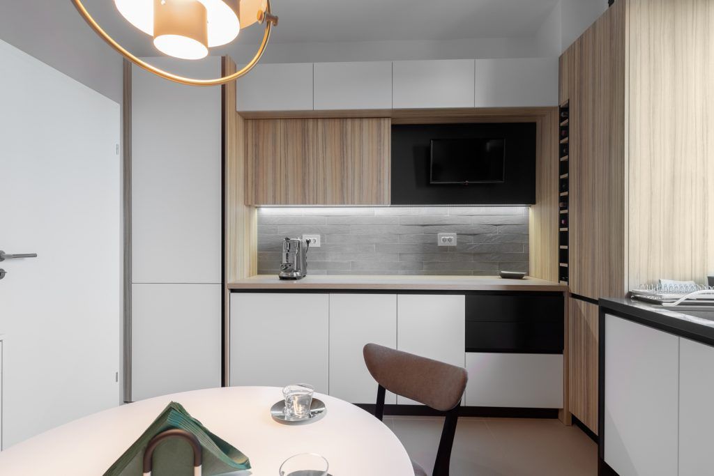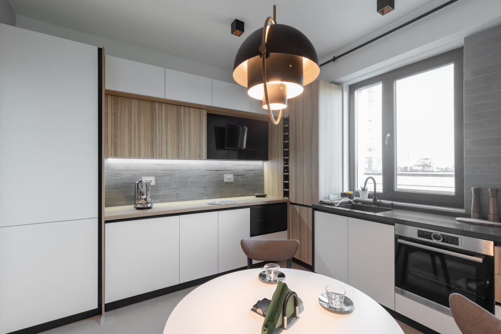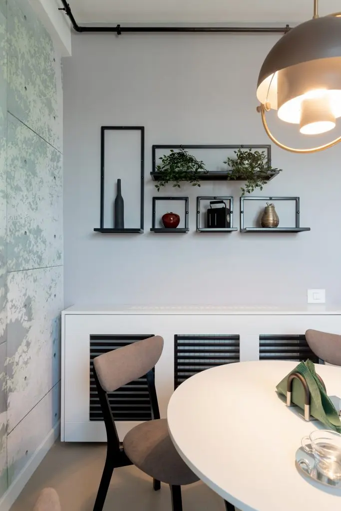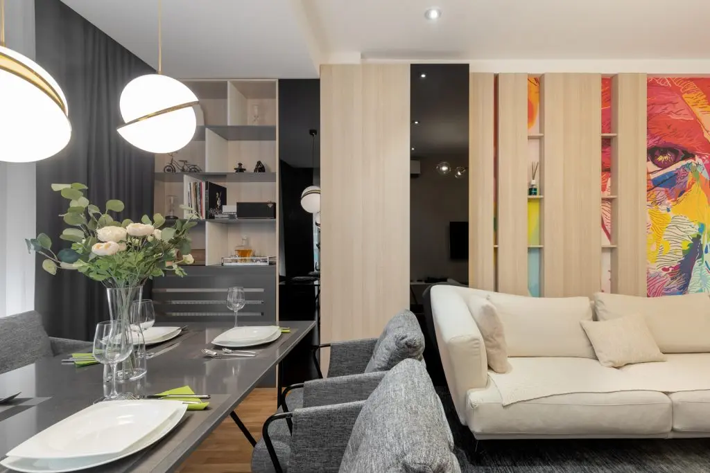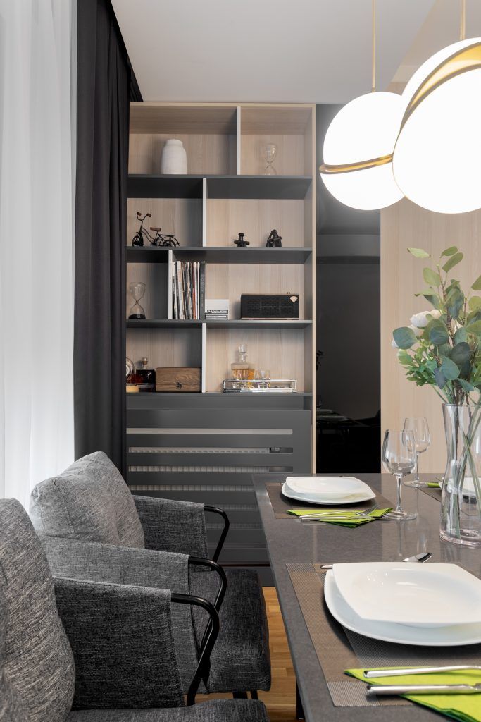 Tavanul coborat deasupra locului de luat masa accentueaza armonios zonificarea camerei. Diferitele nuante de gri si cream creeaza contraste subtile si placute in cadrul amenajarii zonei de zi.