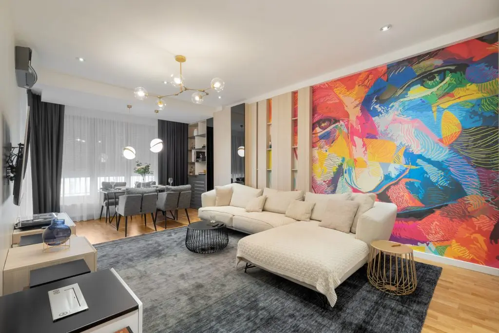 Deschide GaleriaPe un fundal modern, neutru regasim accente puternice de culori si texturi in fiecare spatiu in parte. Vedeta amenajarii ramane insa fototapetul din living, cu o lungime de 5 metri si un model inspirat din cultura pop.